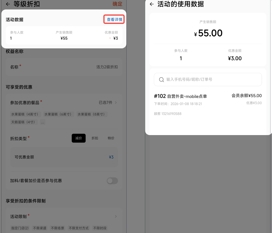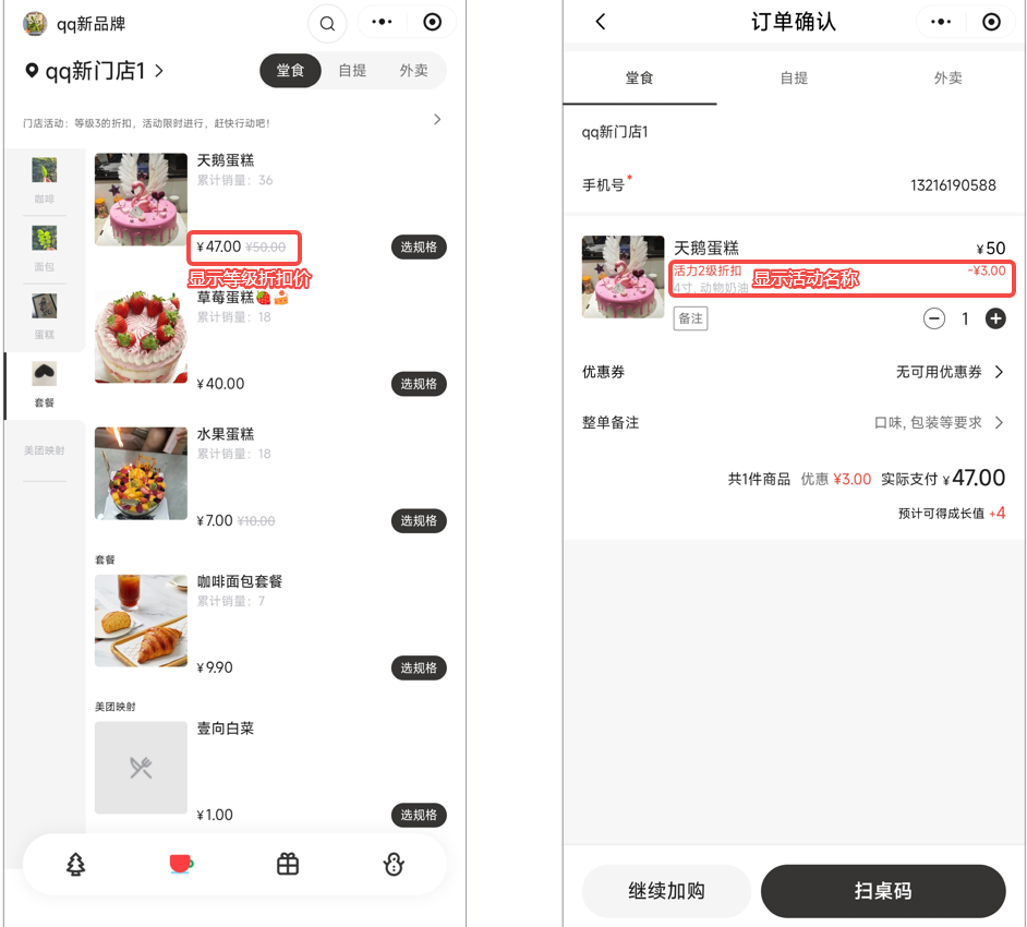 手机端:点单页显示等级折扣价格,结算页显示活动名称和优惠金额。