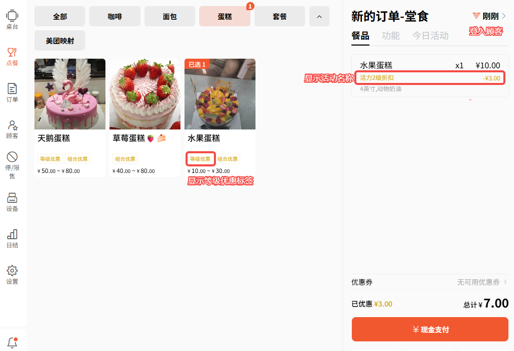 POS机端:登入顾客后,折扣餐品显示等级优惠标签,加入购物车显示活动名称和优惠金额。