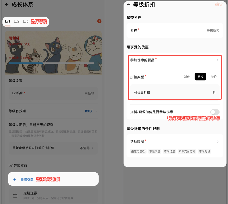 A:一个等级只能设置一个折扣,可以在等级折扣里的设置指定1个门店生效,另外一个门店用单品促销活动,设置限制门店和指定成长等级等级。