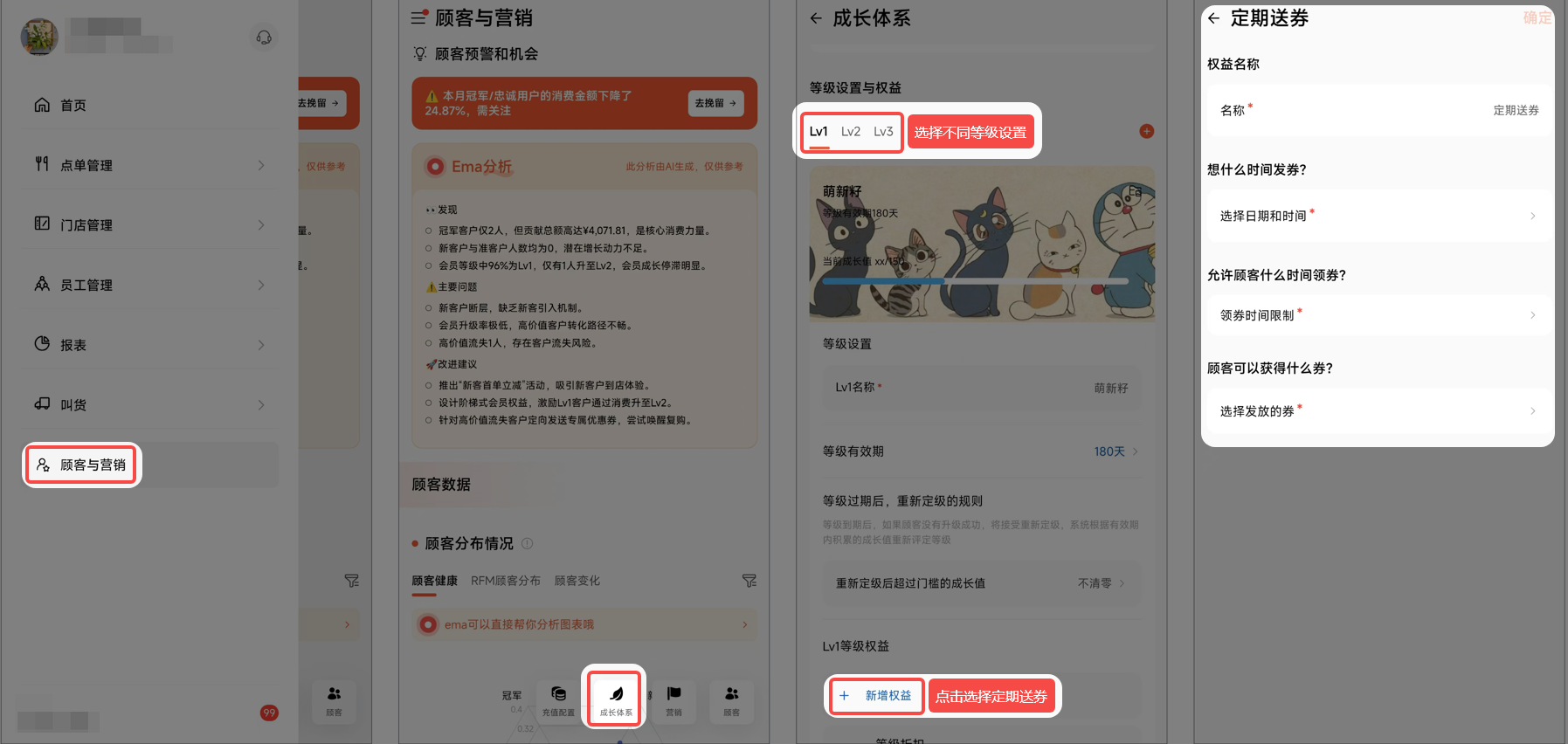 壹向RMSapp - 顾客与营销 - 成长体系 - 选择‘等级’ - +新增权益 选择定期送券 - 编辑详情