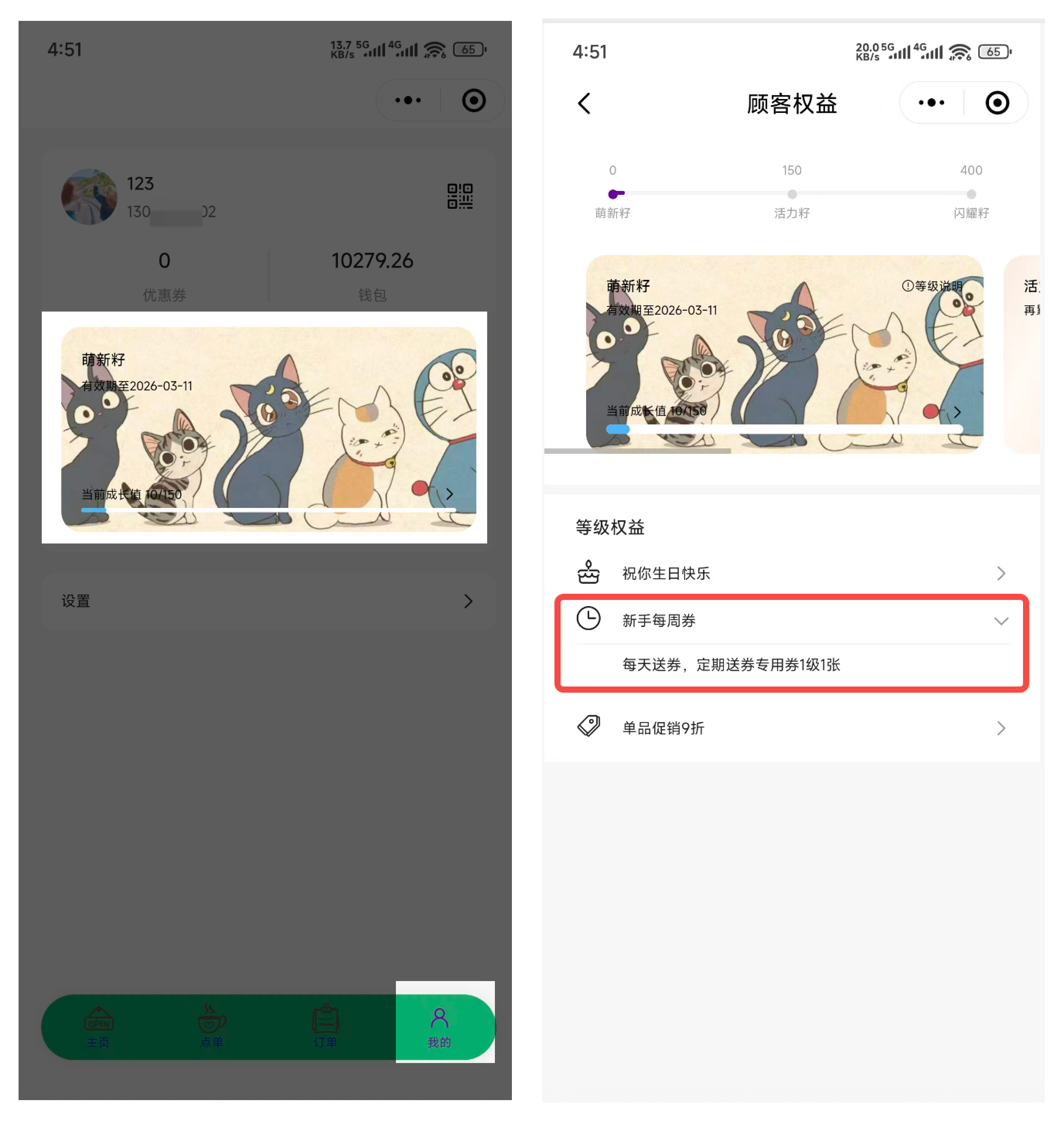 顾客进入小程序-我的-点击等级-在“等级权益”模块会展示活动名称和送券明细