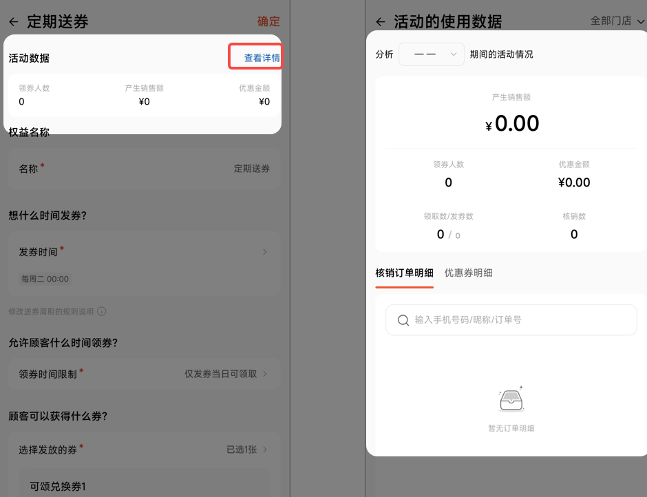A:目前没有针对定期送券的活动数据统计,建议创建单独用于定期送券的优惠券,不关联其他发券活动。然后通过查看优惠券详情里的活动数据来查看发放效果。