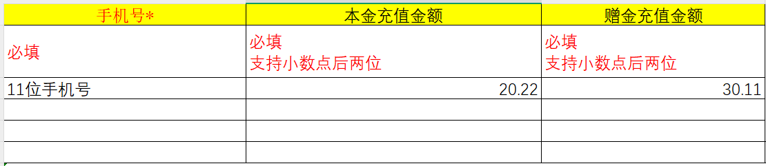 导入充值是在顾客原有的余额上,增加本金和赠金。如填写本金充值金额100元,赠金充值金额20元,那么顾客会增加120元余额。