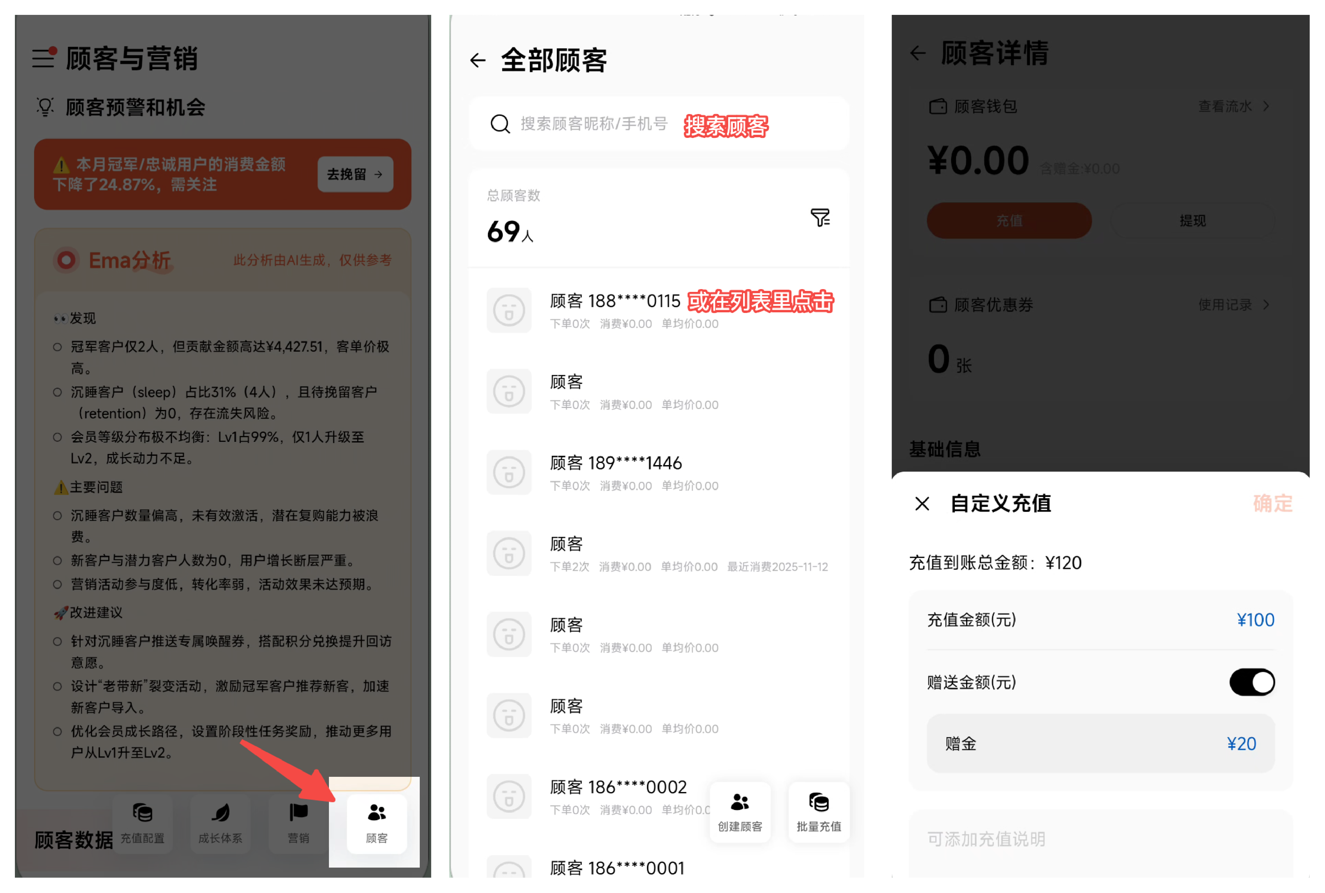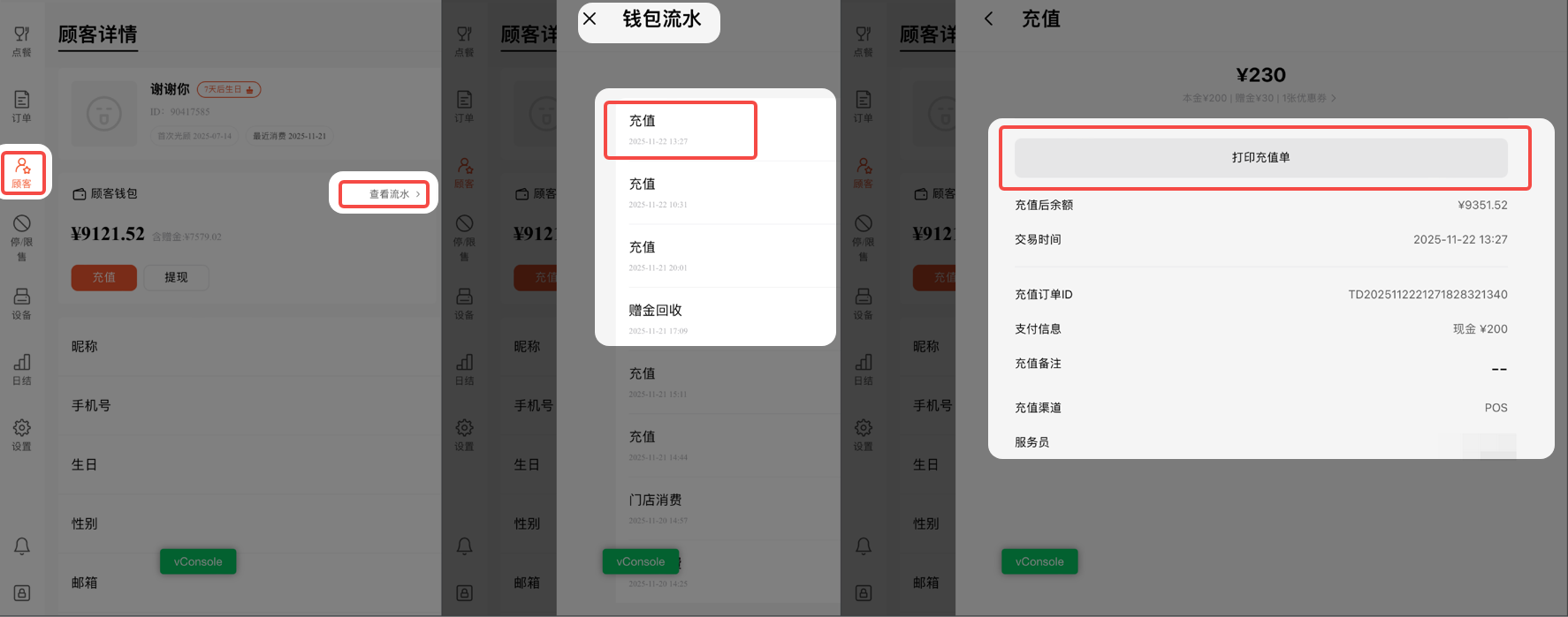 顾客与营销 - 顾客 - 搜索顾客/点开详情 - 点击充值/查看流水。