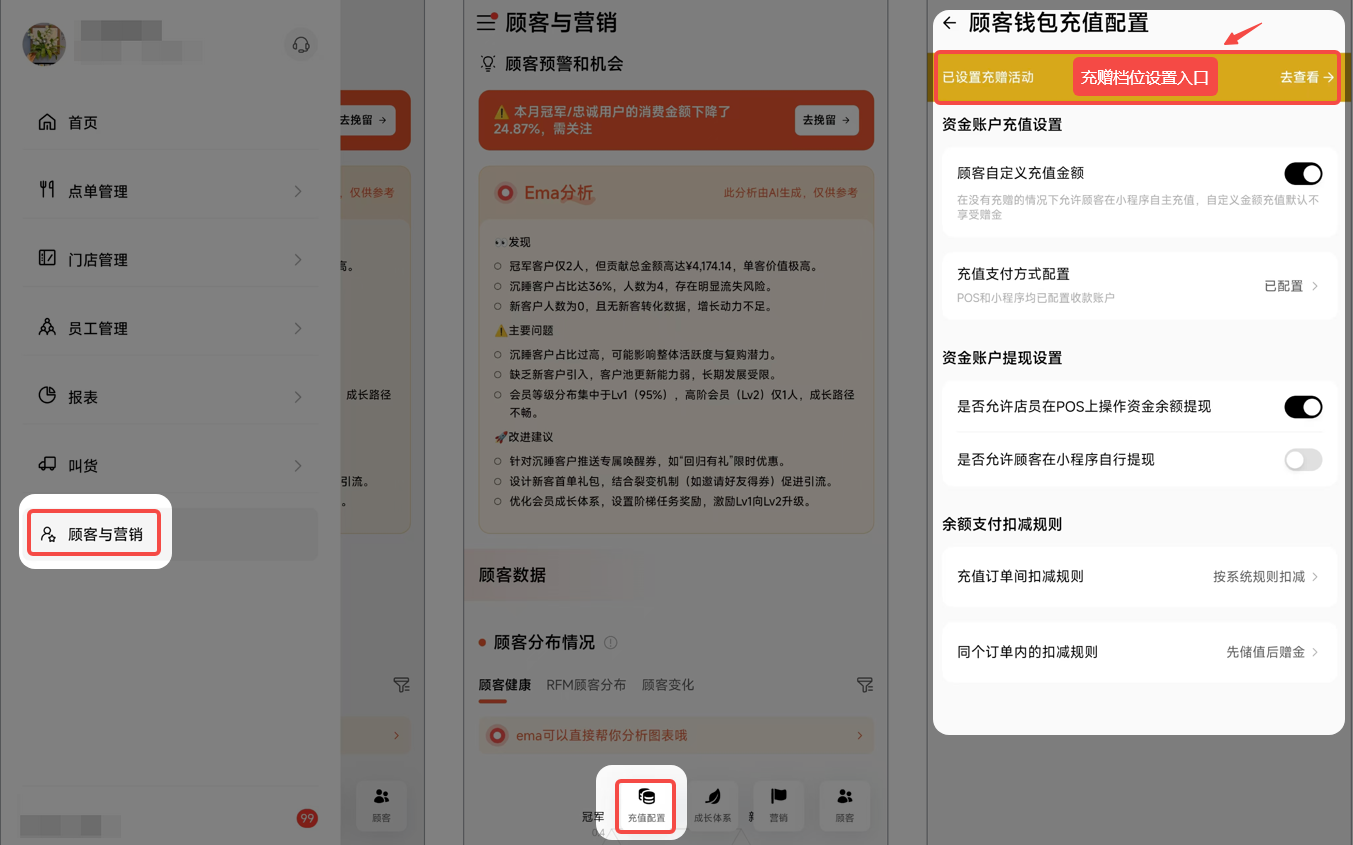 A:RMSapp - 顾客与营销 - 充值配置 - 顶部设置充赠活动。