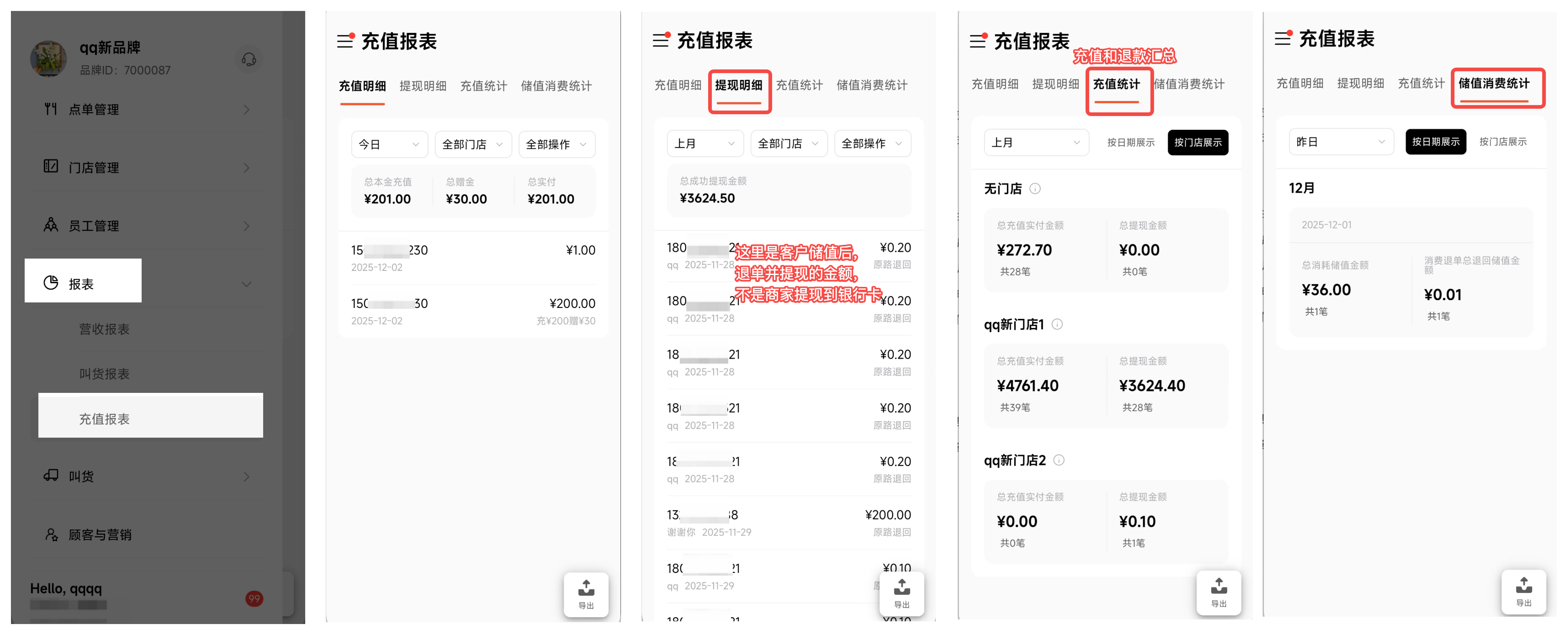 充值统计:次日零点更新。查看充值和退款汇总,可以筛选时间,查看方式可选日期或者门店