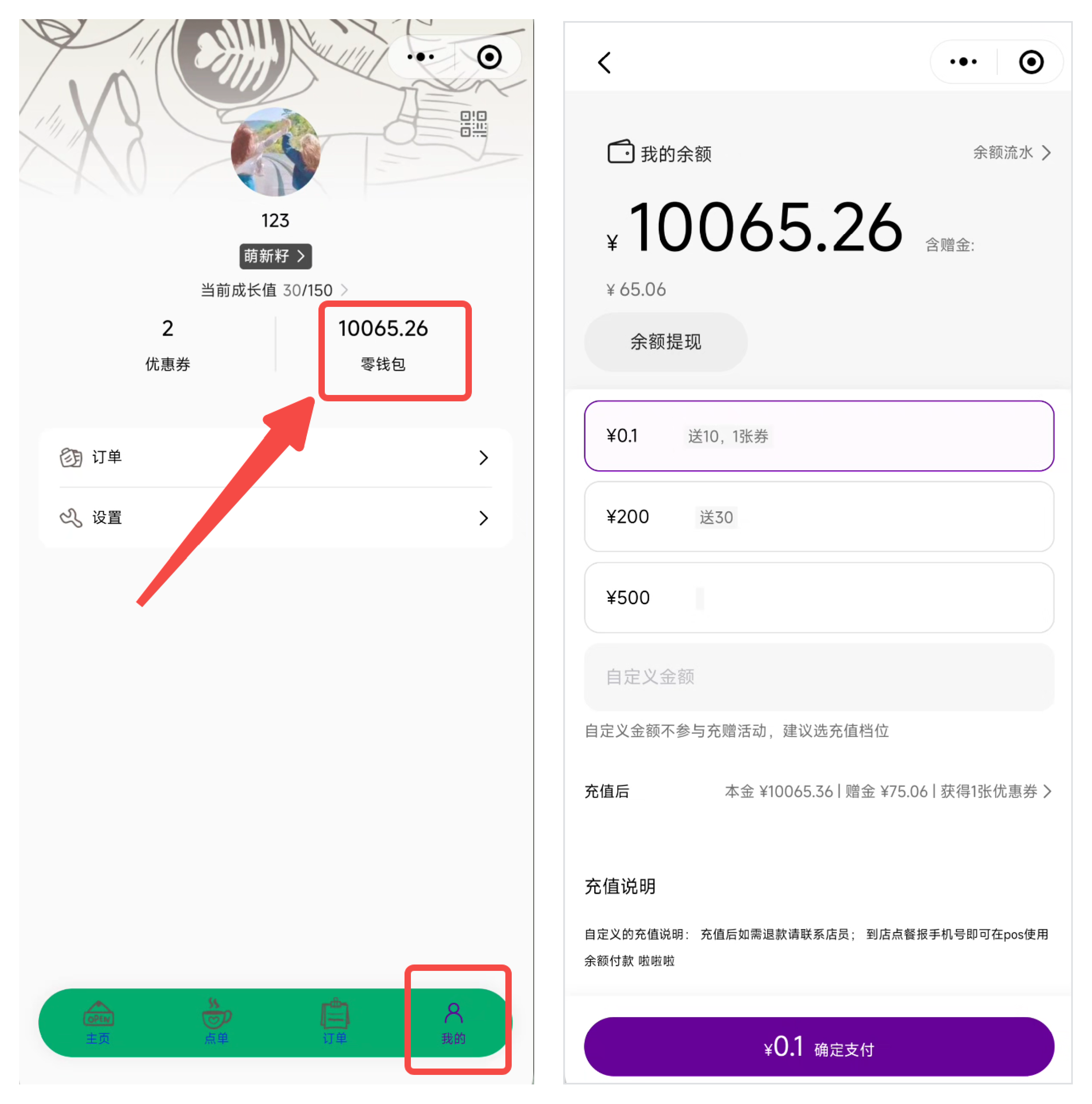 顾客进入小程序 - 我的 - 钱包 - 充值
