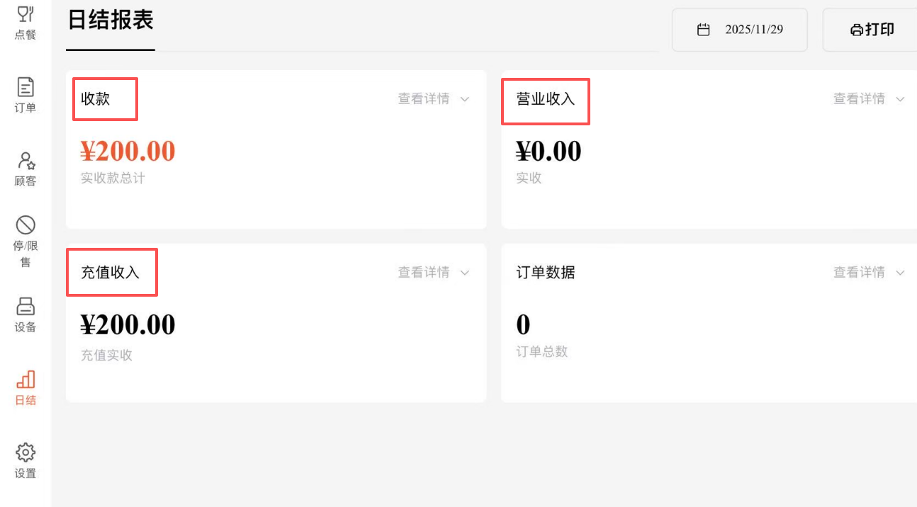 【充值收入】只统计通过POS充值的金额,如果是商家在壹向RMS app充值,或顾客在手机端充值,则不统计,需要在壹向RMS app查看。