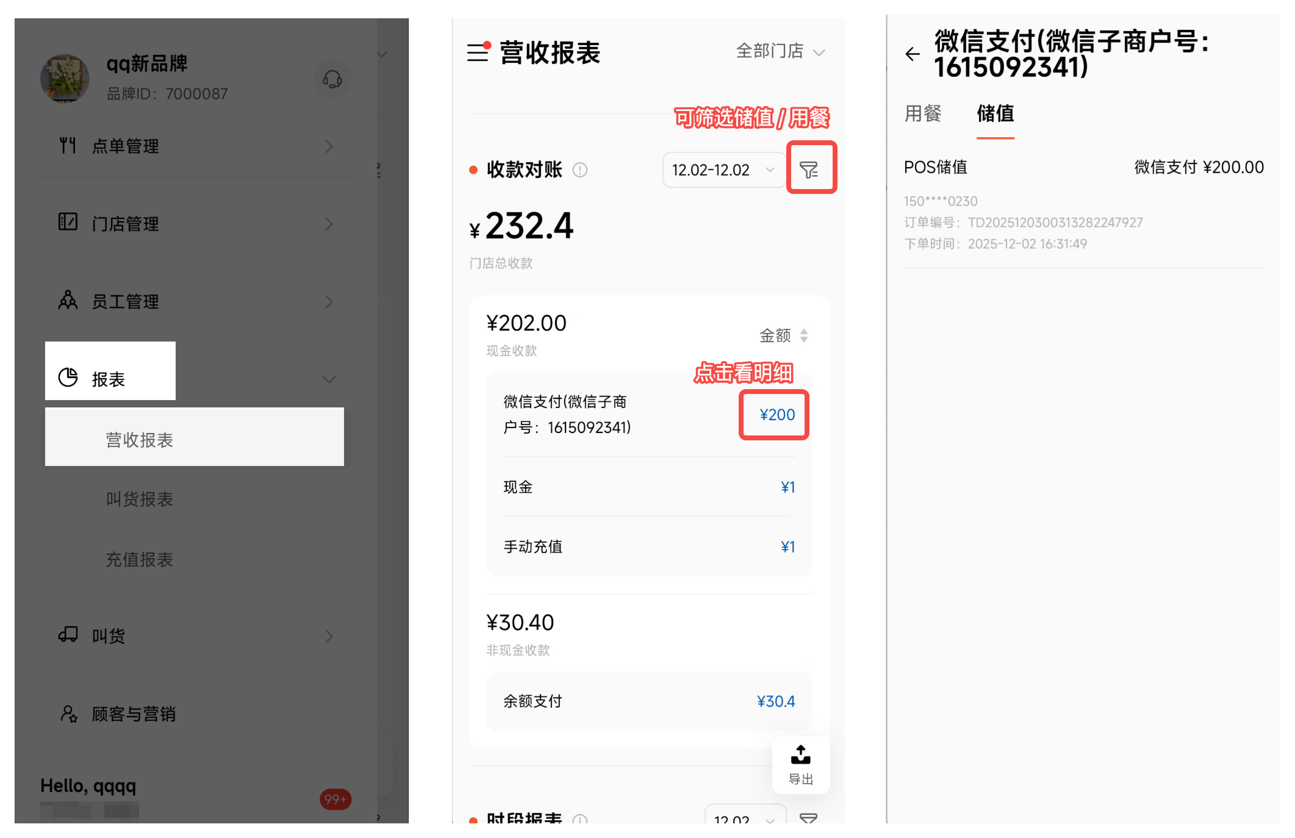 如果顾客充值时使用微信支付200元,收款对账表里就会显示“微信支付200元”;然后顾客下单,用储值余额支付了30.4元,收款对账表里就显示“余额支付30.4元”。也可以理解为,顾客充值余额,和余额消费,在收款对账表里会统计两次。