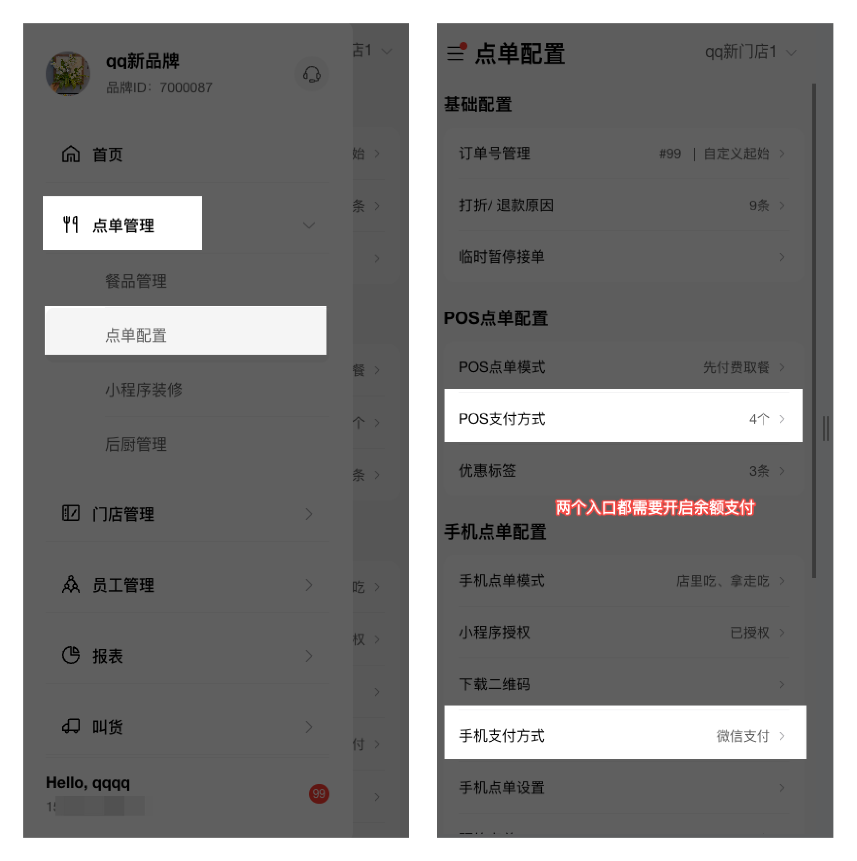 RMSapp:点单管理 - 点单配置 - POS机付款方式/手机支付方式 - 分别开启余额支付。