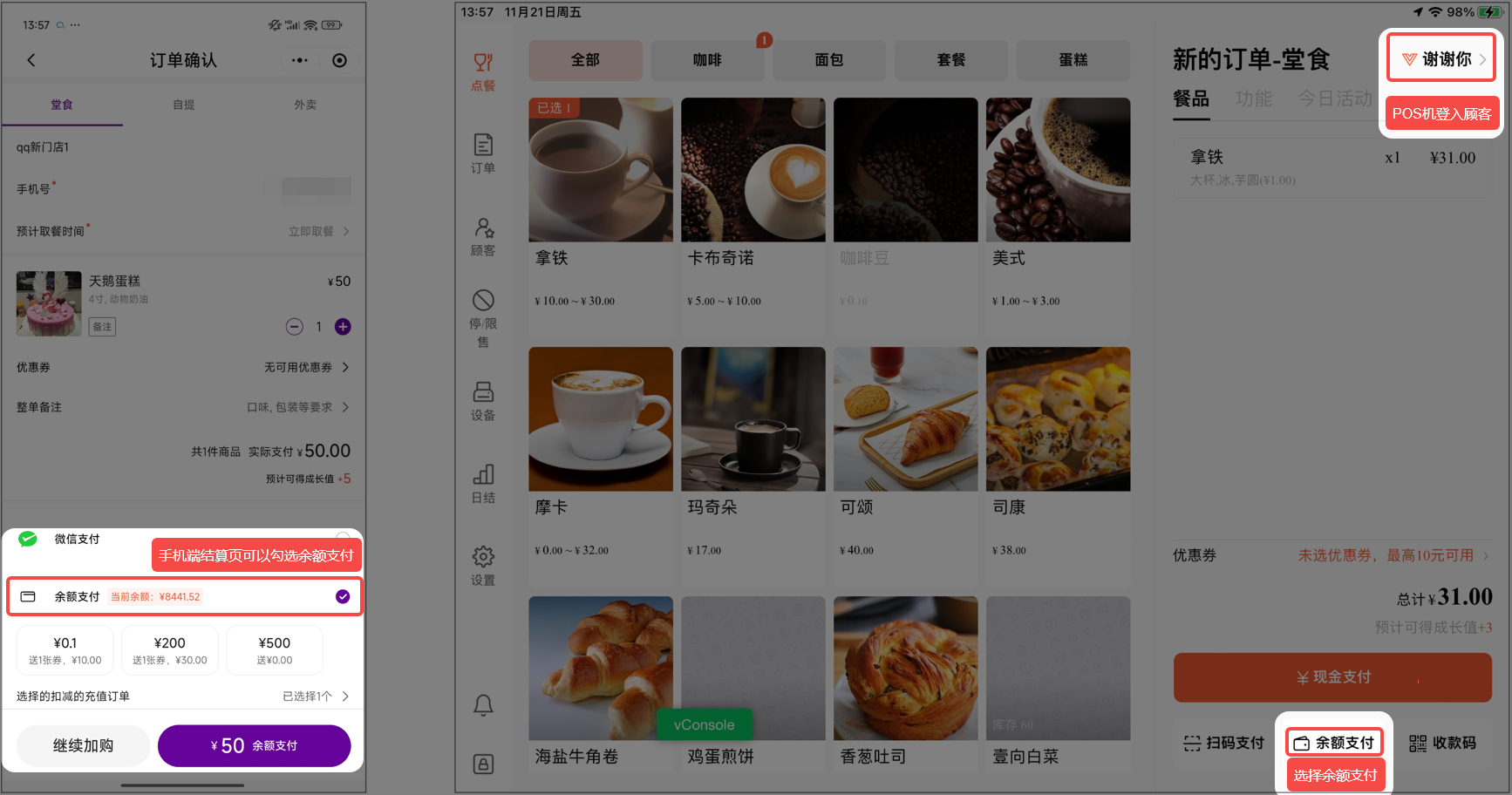 POS机端:右上角登录顾客,支付时有【余额支付】选项。
