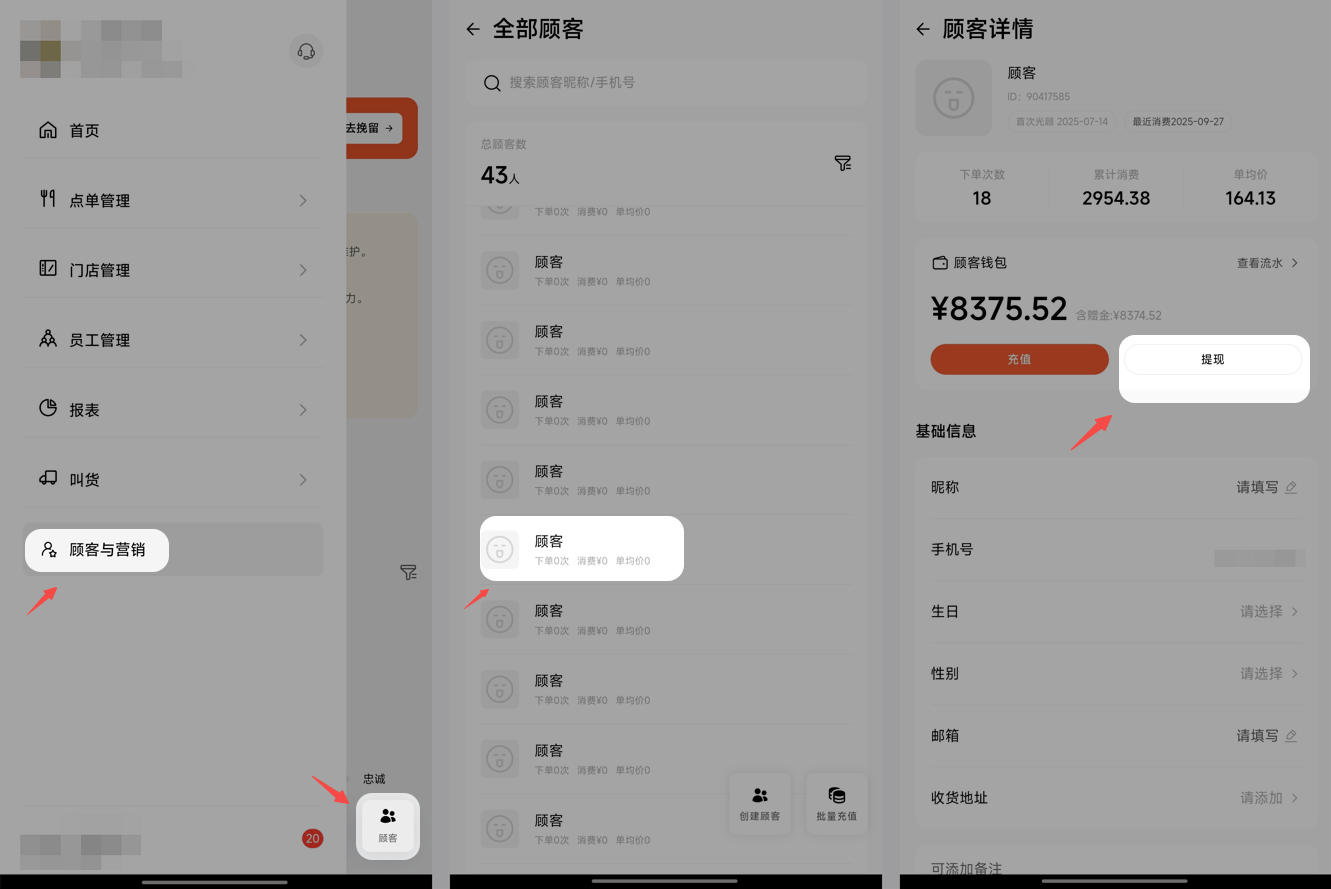 左侧菜单【顾客与营销】→点击右下角【顾客】→点击对应的顾客打开详情→点击【提现】