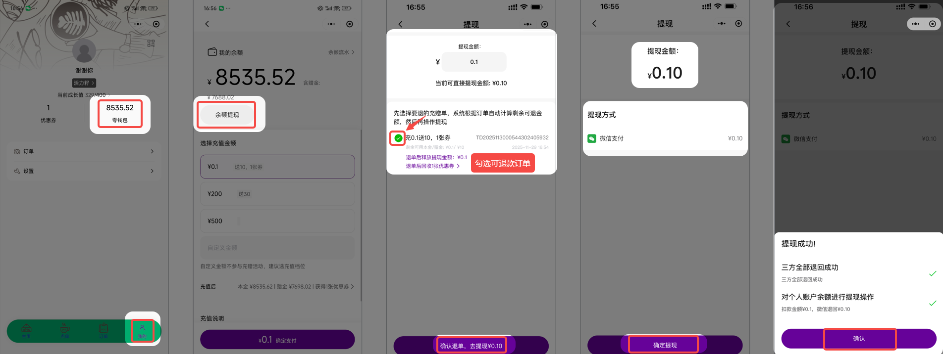 →点击可以操作的充值订单【退单】,完成后显示提现金额→点击右上角【确认提现】
