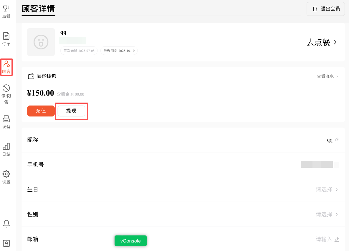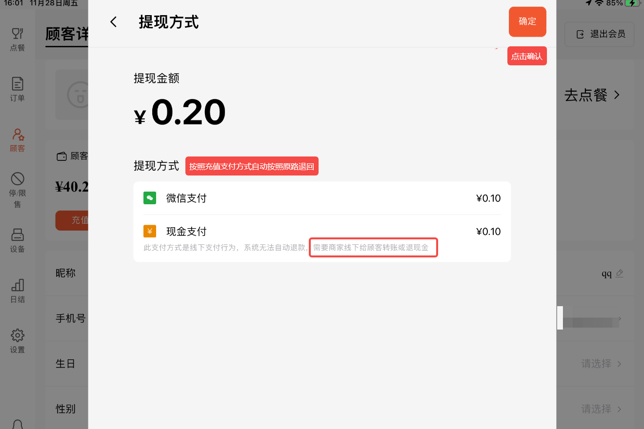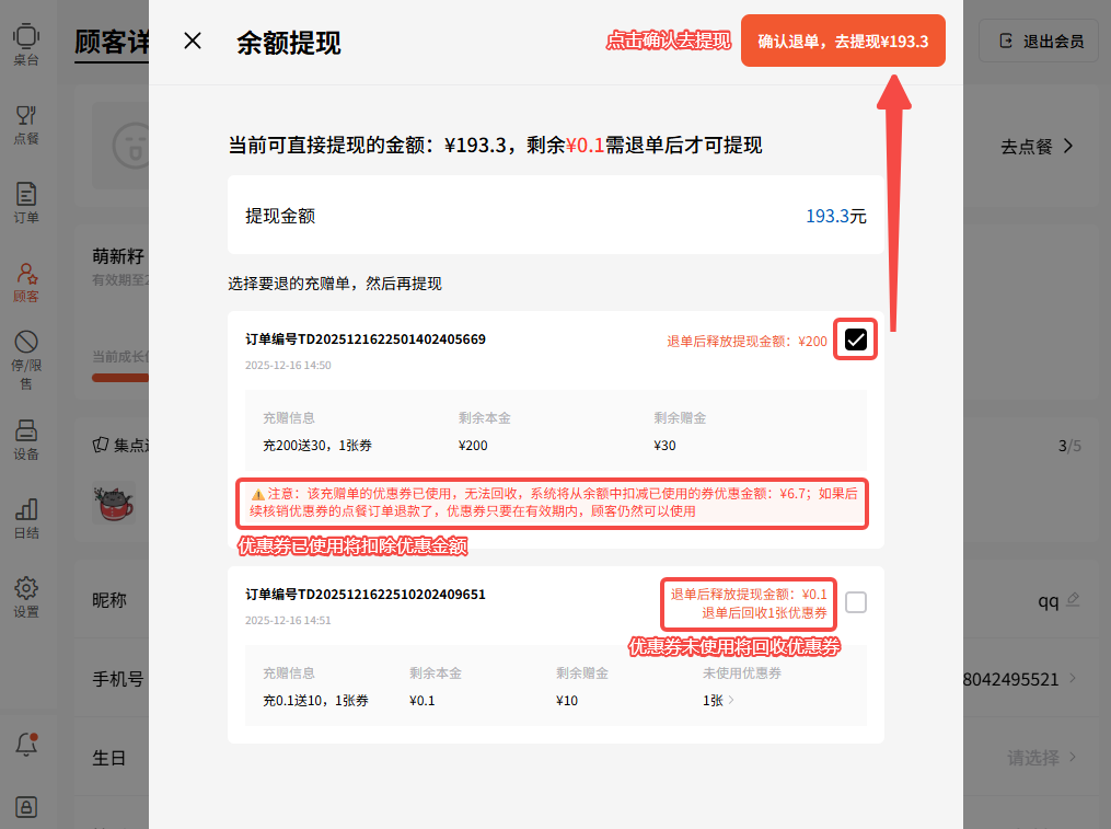 未显示【提现】字段,说明还操作完成退款,回到顾客详情页,点击余额【提现】查看可提现金额,继续点击右上角【确认提现】完成退款。