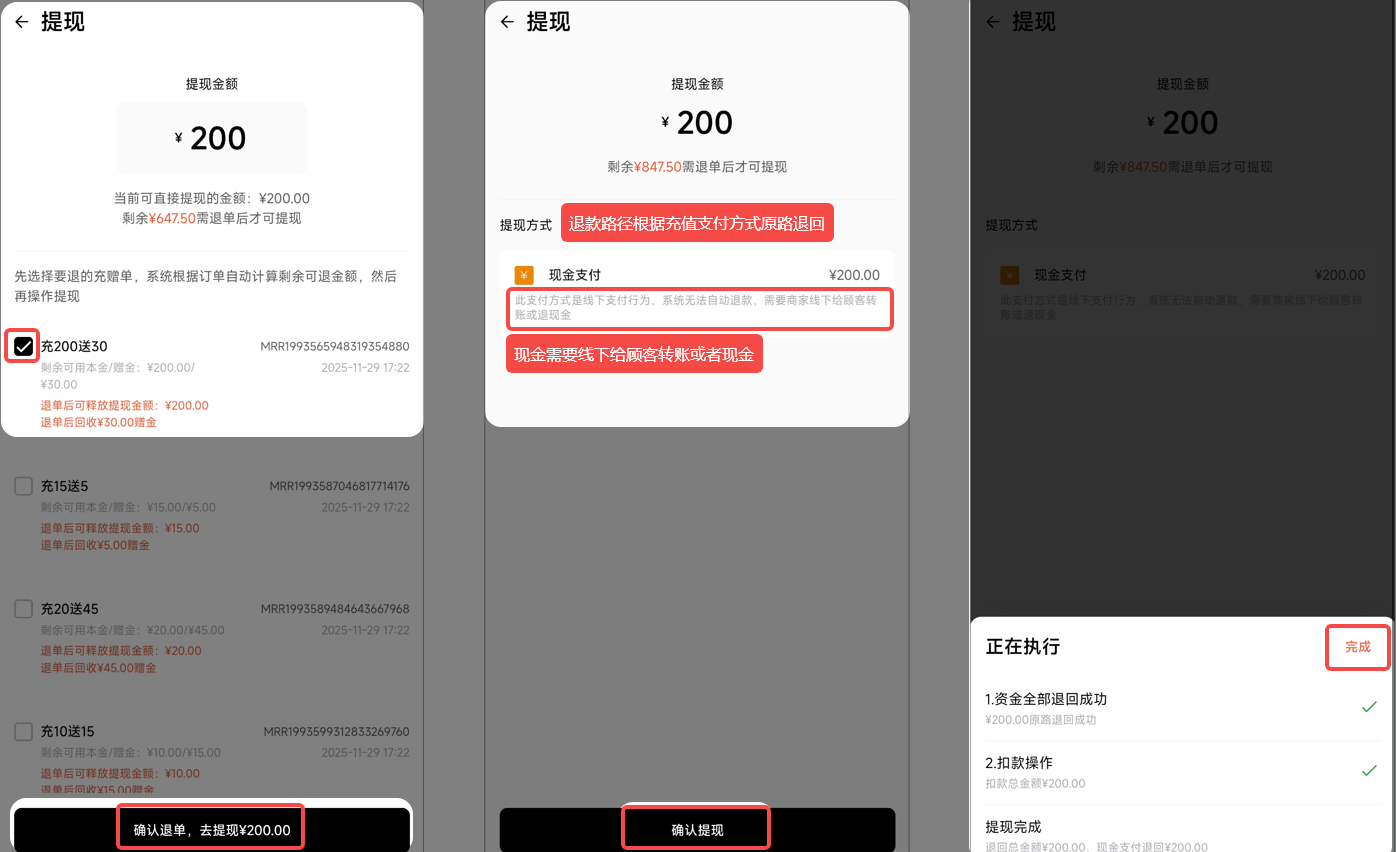 a.余额这里显示的【提现】是把顾客中的本金退给顾客,不是把充值的钱提现到商家的银行卡。