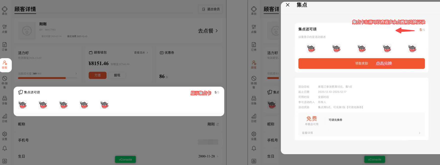商家在pos上登录顾客,点击集点活动,帮顾客兑换券。