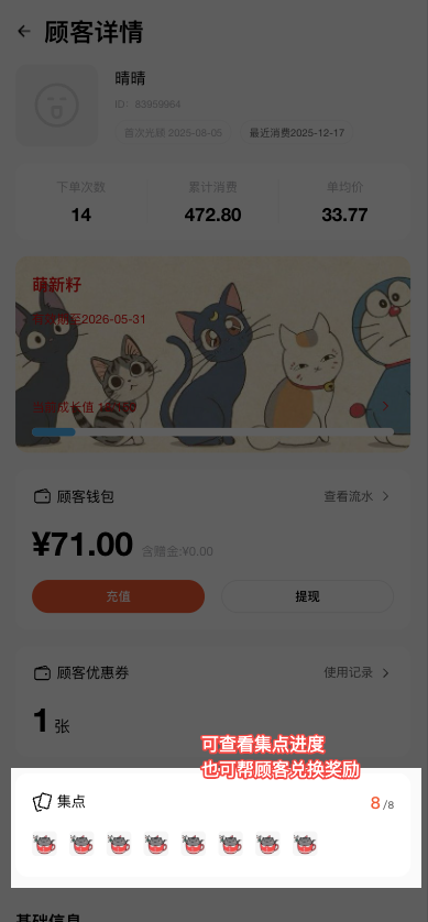 顾客与营销-顾客-点击顾客,可查看集点进度,也可帮顾客领券