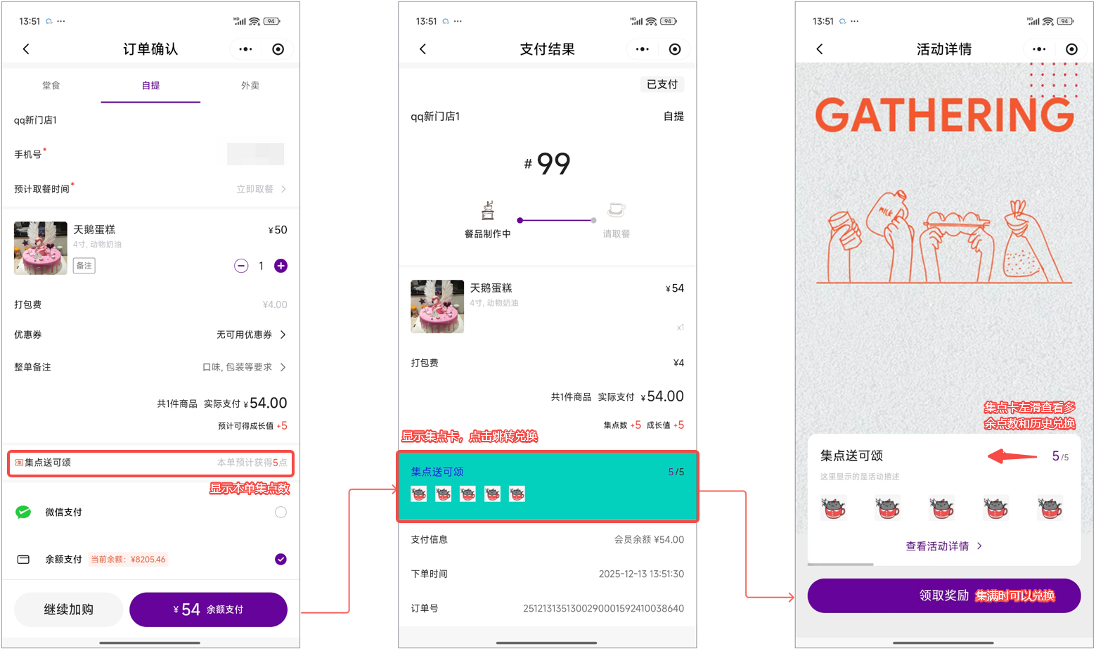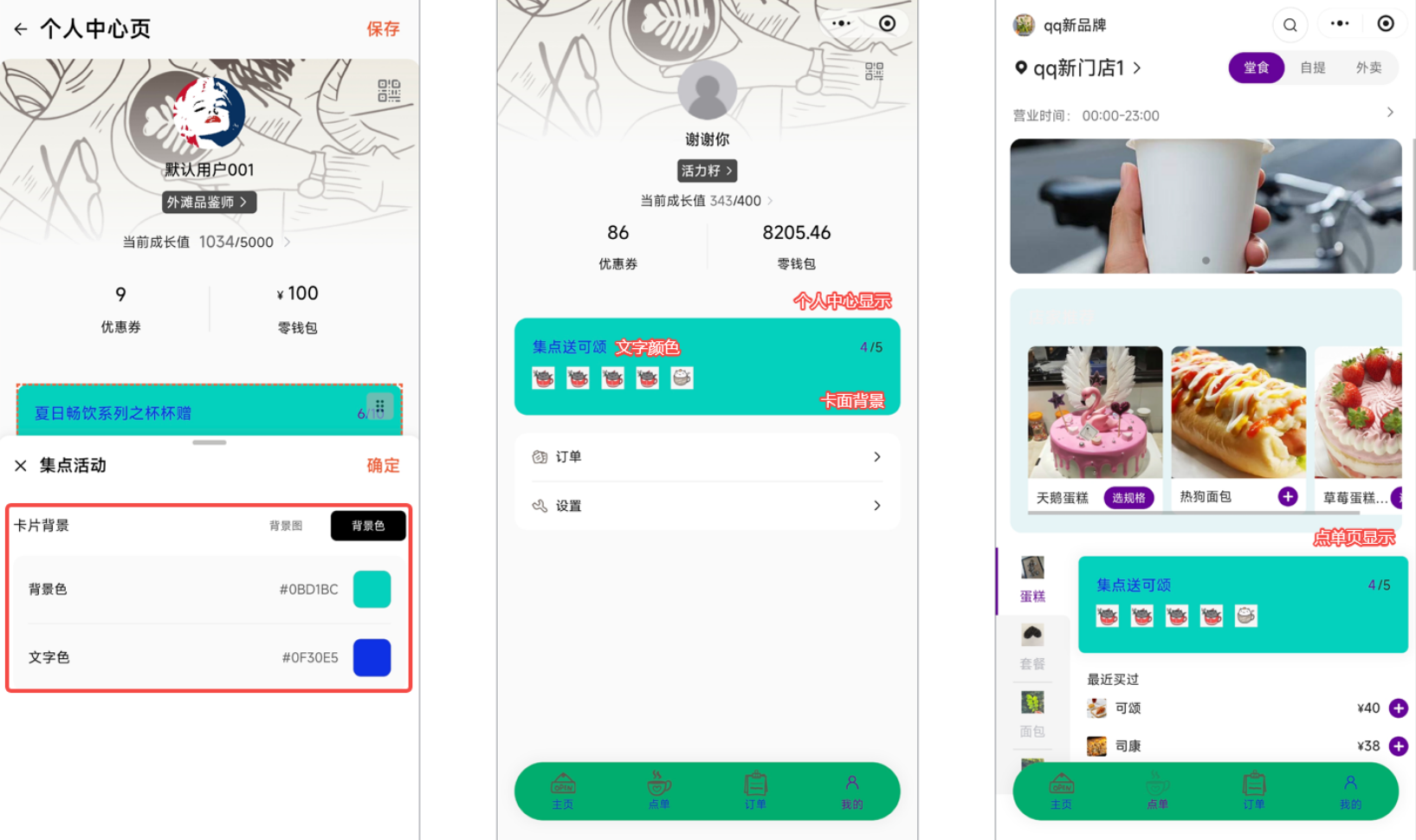 注:集点活动创建后默认在点单页、支付完成页、个人中心页显示。