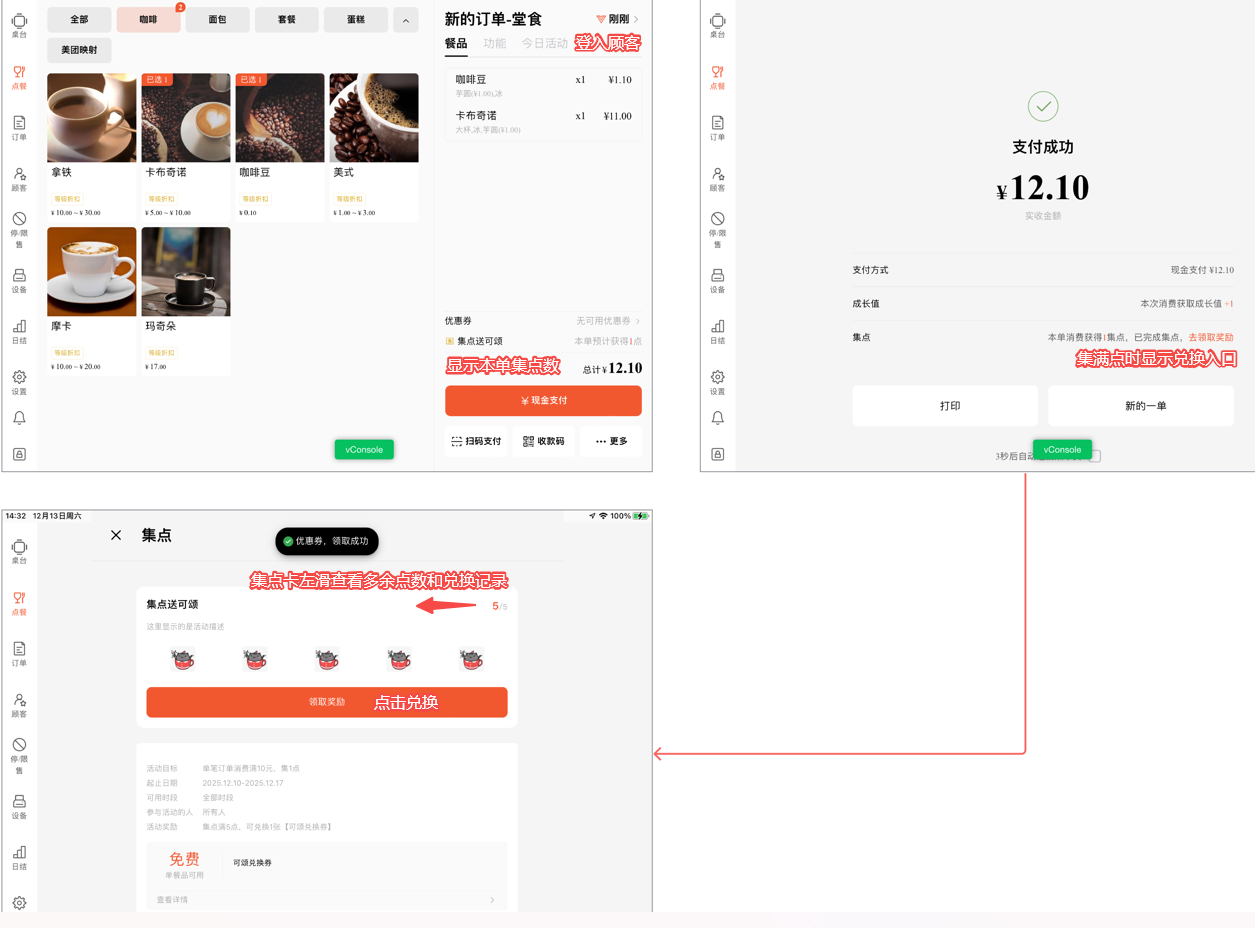 顾客下单获得集点,满足后点击集点卡兑换优惠券