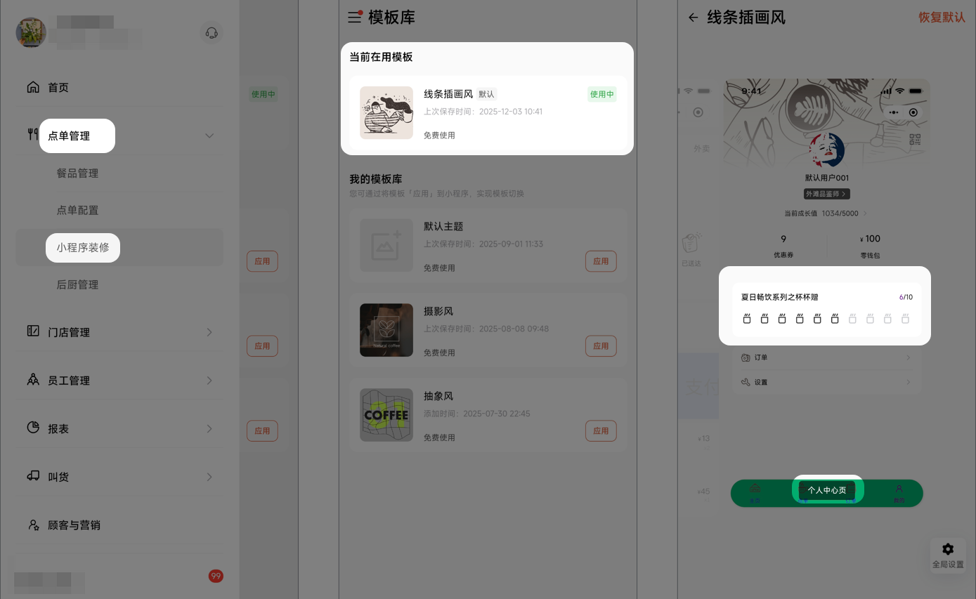 个人中心页装修路径:RMSapp - 点单管理 - 小程序装修 - 点击在用模板 - 左滑选到个人中心页 - 点击集点模块编辑