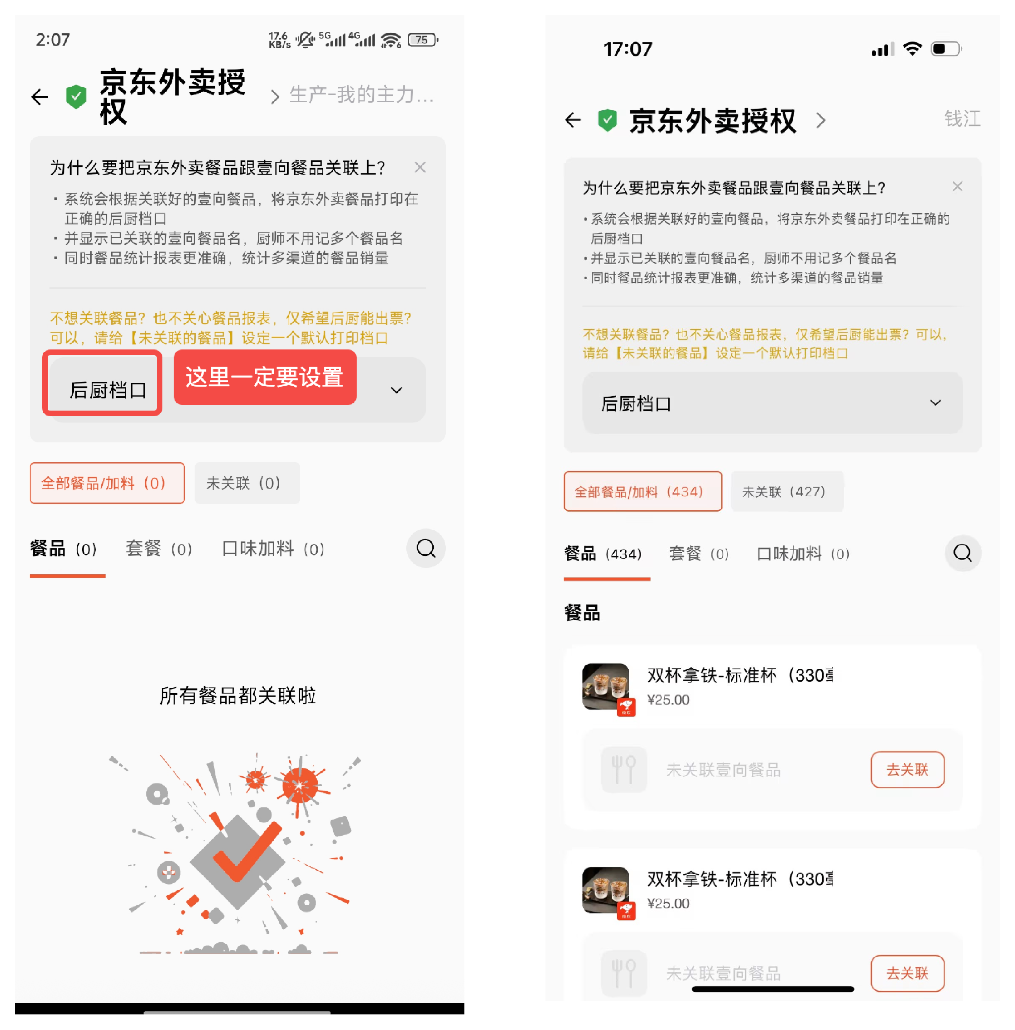 授权后,点击京东外卖入口会进入餐品关联页,一定要给未关联的餐品设置一个默认档口,避免影响打印。