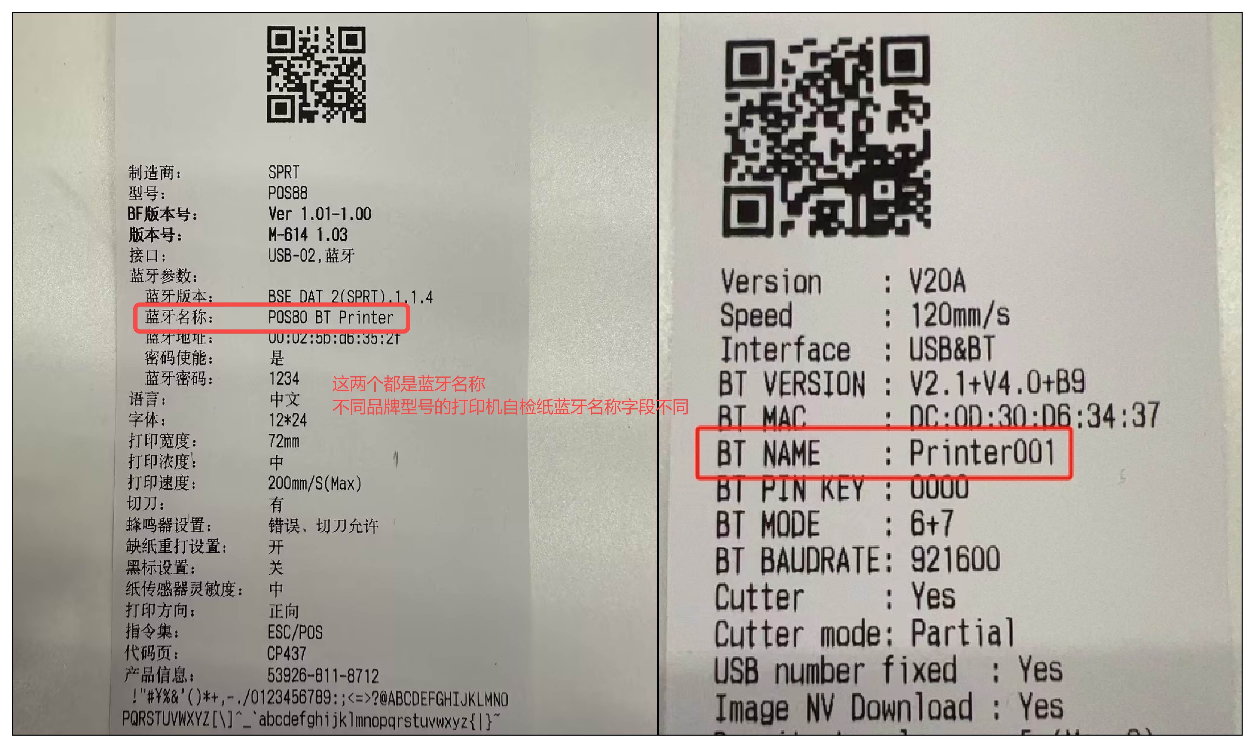 先打印自检纸,步骤如下:打印机关机,然后长按FEED键5秒不松手,同时按开机键,再等3秒松开FEED键,会打出一张很长的纸,纸上有打印机的蓝牙名称(如果打印不出来,请联系打印机厂商处理)。