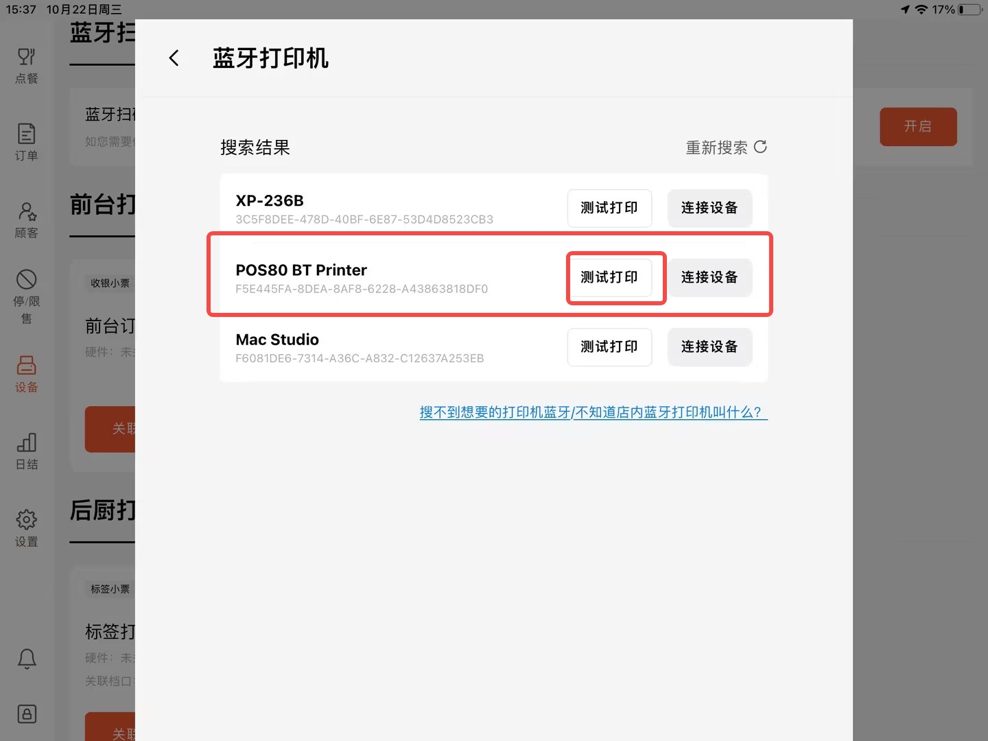 第四步:可能搜到多个蓝牙,对比在自检纸上的蓝牙名称,点击【测试打印】,查看打印机是否有出测试纸。出纸后点击【连接设备】(如有多台相同型号的打印机,蓝牙名称可能是一样的,一定要确认出纸后再连接)