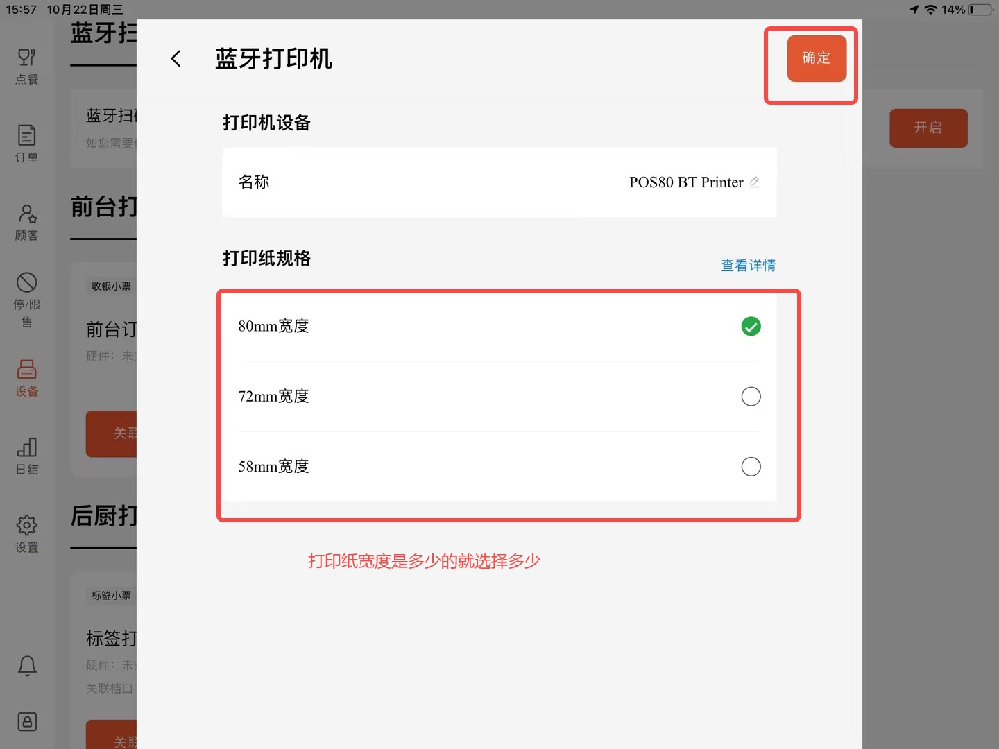 热敏小票尺寸设置路径:壹向POSlite - 设备 - 找到已连接的小票打印机-打印机设置-点击宽度即可修改
