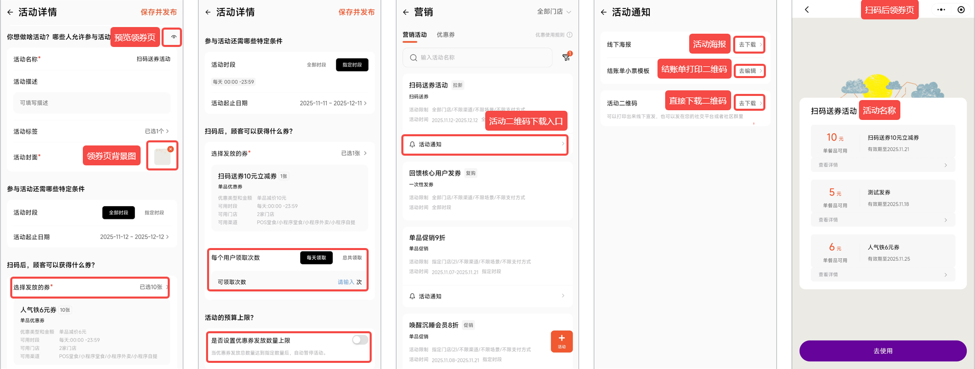 举例:设置上限为22张,顾客每次扫码设置可以领取10张,当第三次扫码领取之后,3次合计被领券30张,超出了22张上限,活动将自动结束,第四次扫码就会提示活动已结束。活动二维码下载:创建完活动之后,在活动列表点击【活动通知】可以下载活动二维码,顾客扫码二维码进行领券。