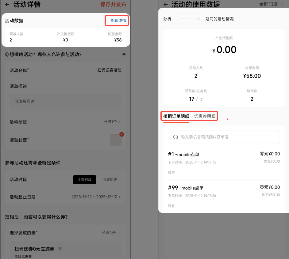 顾客扫码领券以及用券消费会生成活动数据,在活动详情顶部点击【查看详情】
