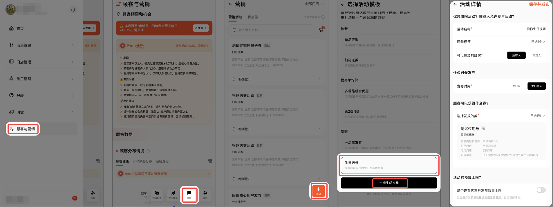 路径:壹向RMSapp - 顾客与营销 - 营销 - 点击+与营销 - +营销 - 生日送券 - 一键生成方案 - 编辑详情