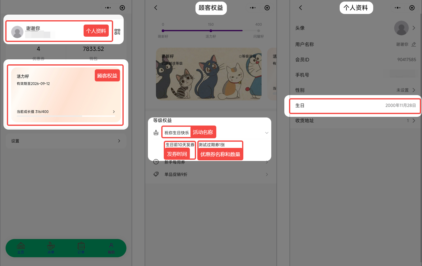 在等级权益中可以查看生日送券详情,展示活动名称、发券时间、优惠券名称和数量。