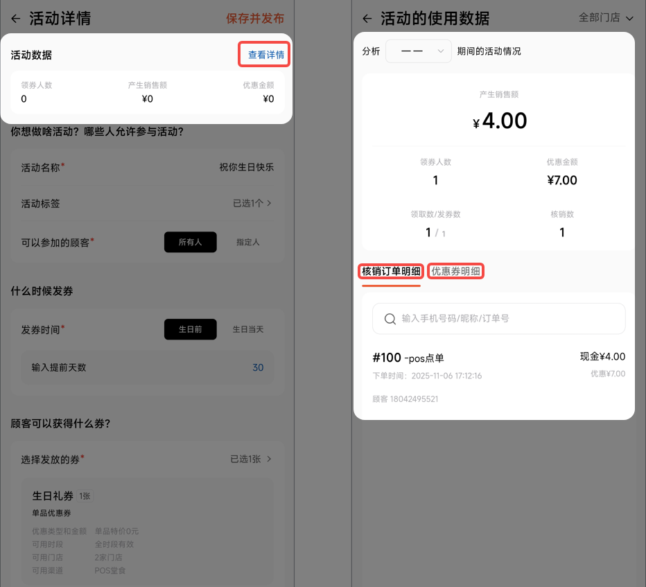 底部可以查看【核销订单明细】和【优惠券明细】