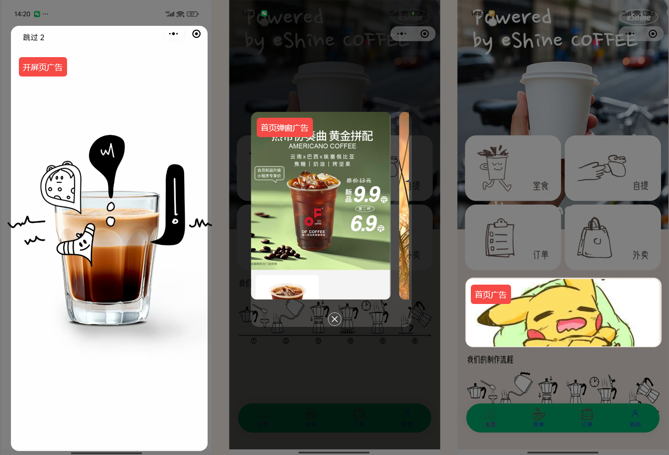 A:1)首页弹窗广告/点单页弹窗广告/菜单广告: