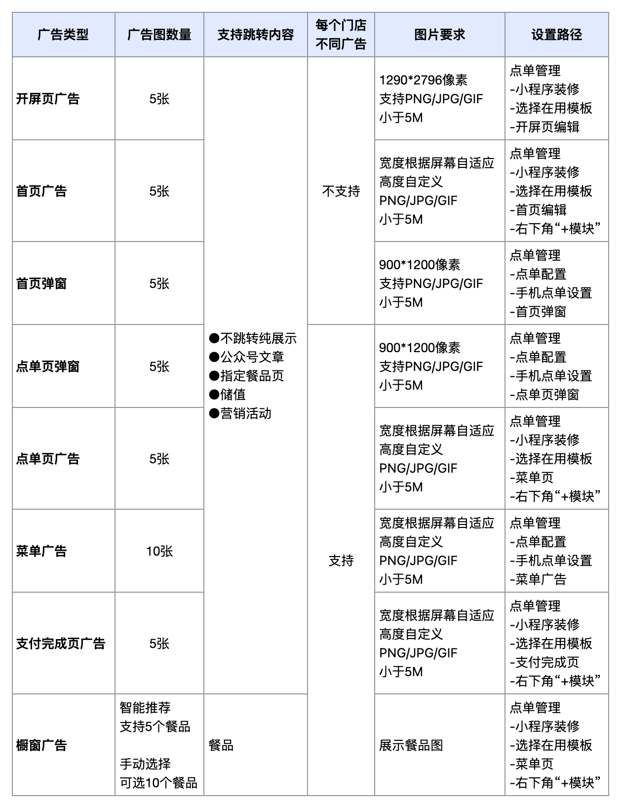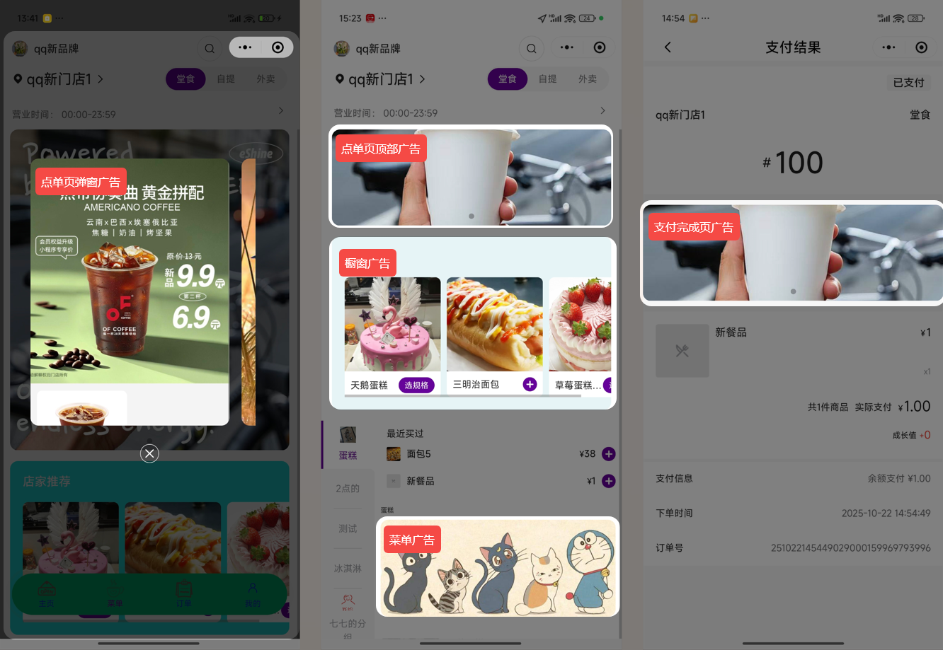 2)开屏页广告/首页广告/点单页顶部广告/橱窗广告/支付完成页广告: