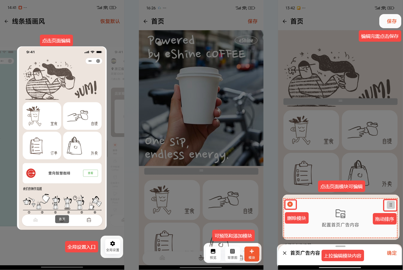 模块排序:点击对应模块,右上角有一个灰色的6个小圆点的图标,按住拖动调整排序;