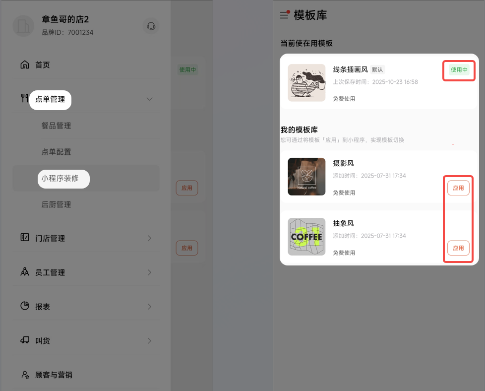 装修入口:壹向RMSapp--点单管理--小程序装修--选择模板