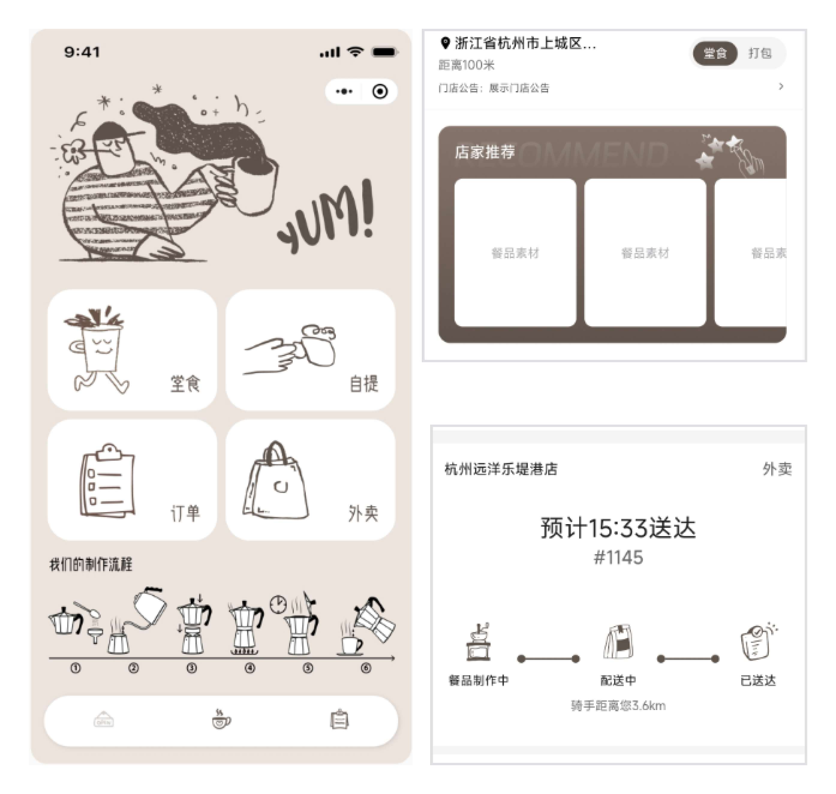 温润的手绘线条和浅咖啡色背景营造治愈氛围,适合精品咖啡馆、手冲咖啡店等小而美店铺,帮助用户沉浸在舒适的慢节奏点单体验中。