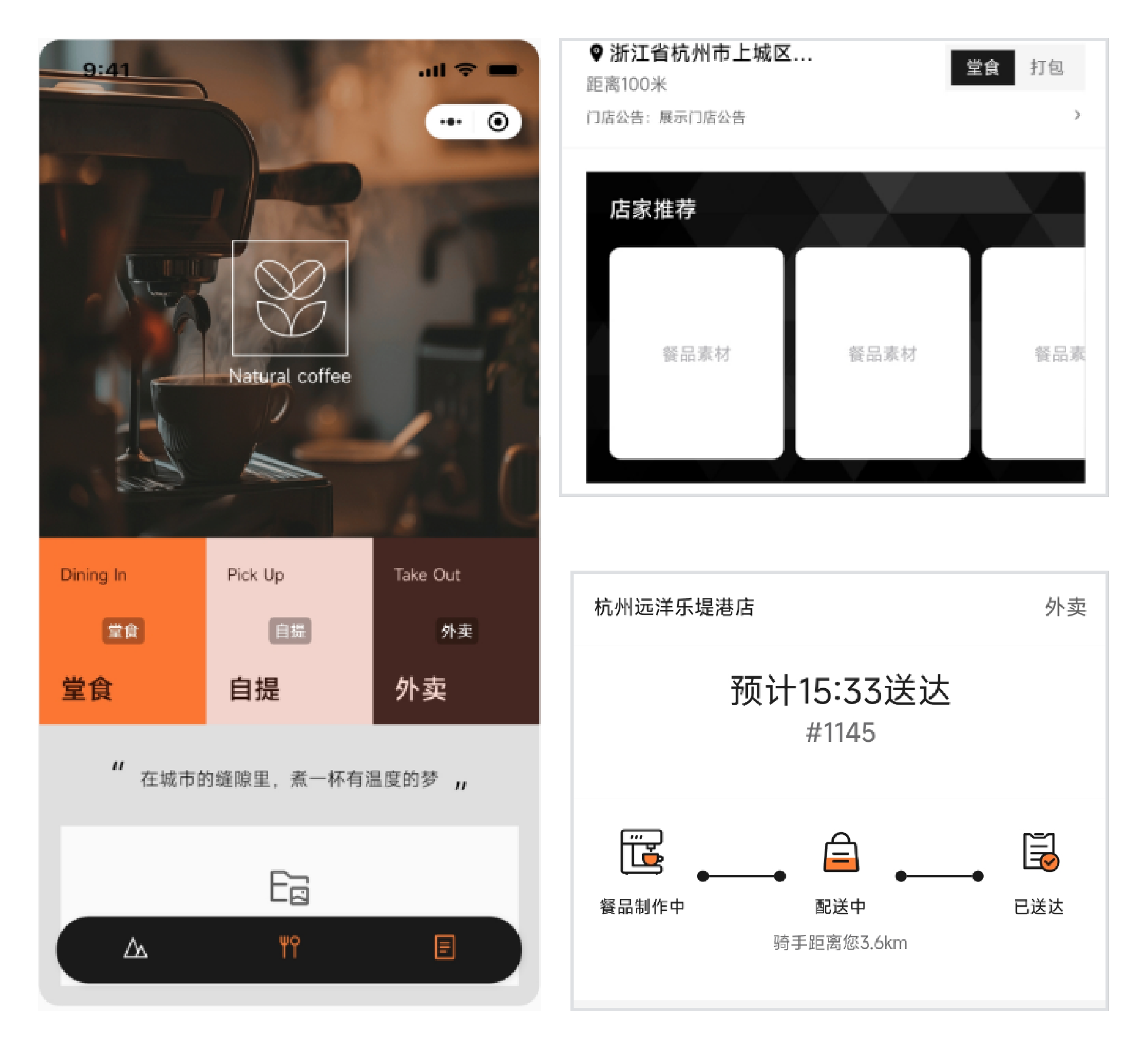 以黑橙为主调,融合手冲咖啡、拉花等实景元素,打造质感与氛围并存的点单界面,适合都市精品咖啡店、独立咖啡馆使用,让顾客快速沉浸在温暖最且专业的咖啡体验中。