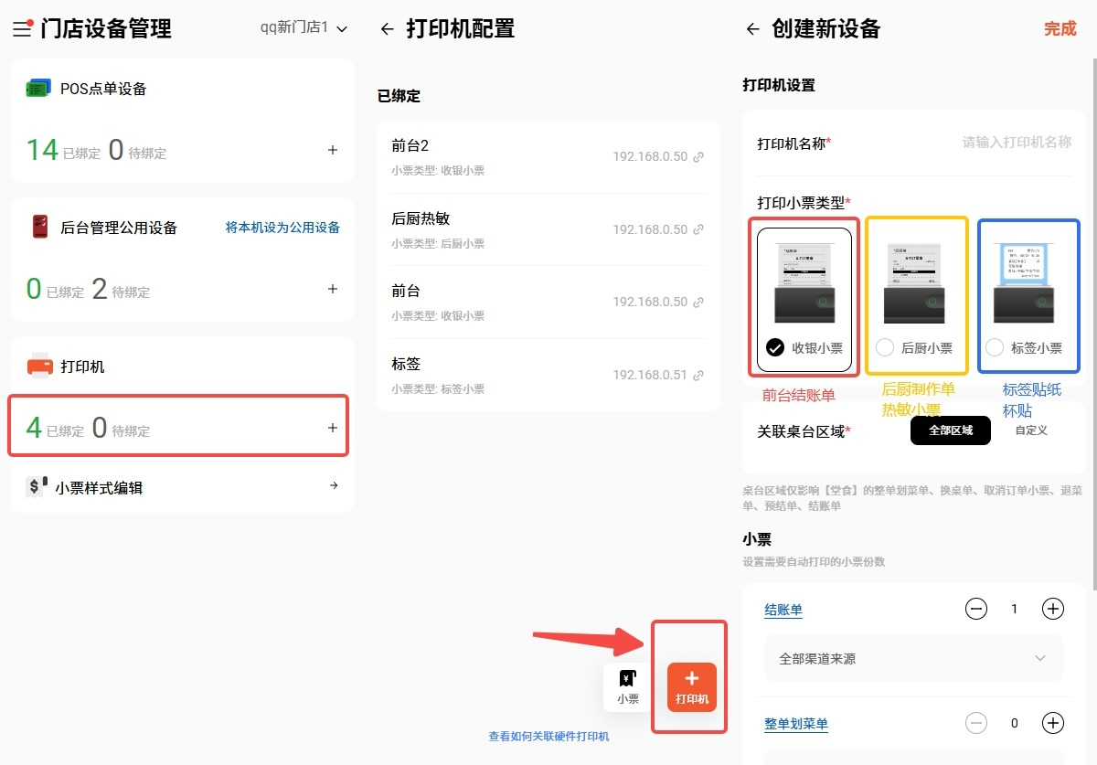 收银小票、标签小票、后厨小票关联打印机方式都是一样的