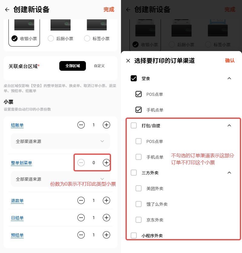 选择就餐方式:选择哪些渠道打印标签。举例:希望自提和外卖订单才打印标签,就只勾选自提和外卖