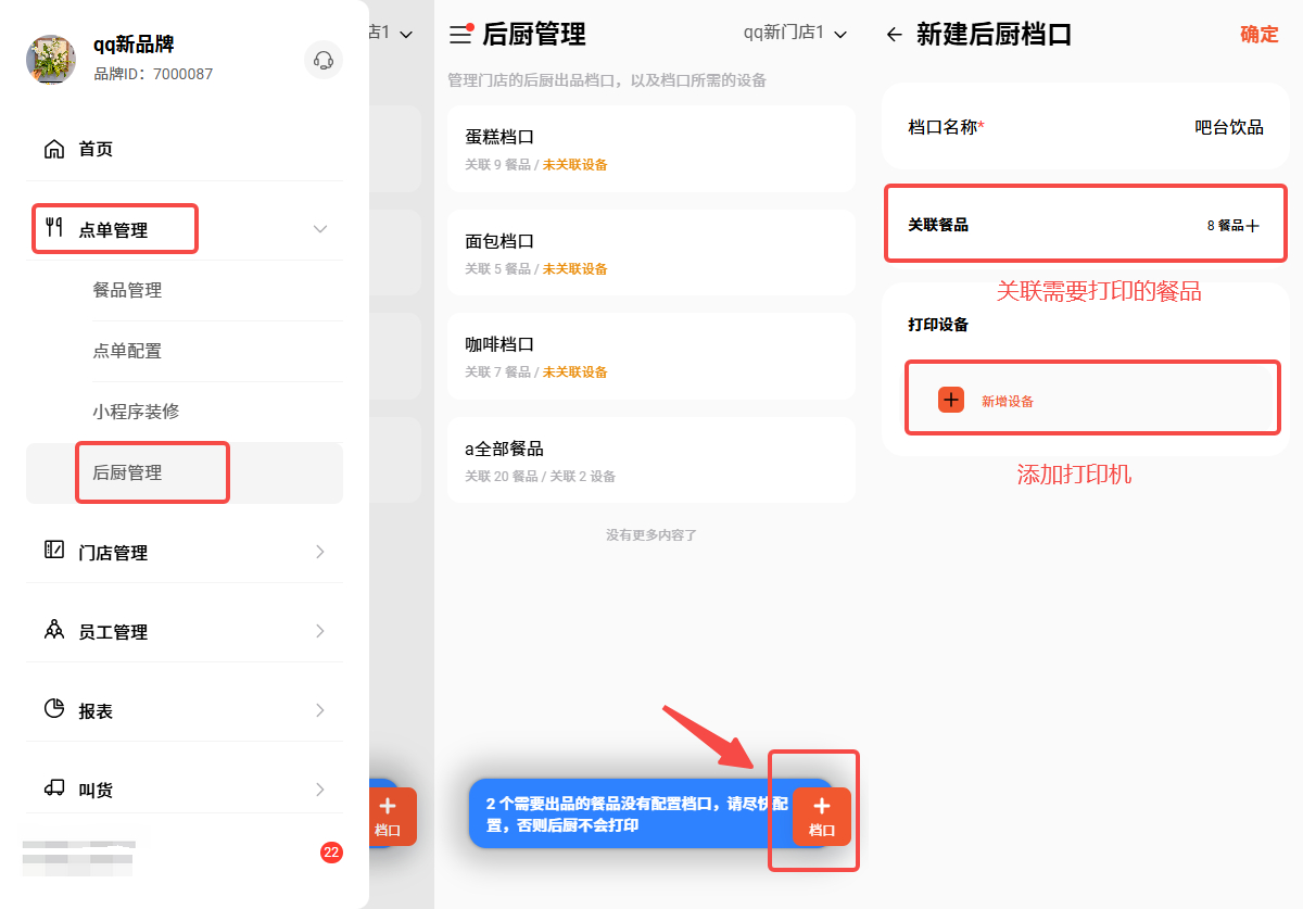 第一步:点单管理--后厨管理--新增档口,哪些餐品需要打印后厨小票/标签小票,档口就关联哪些餐品