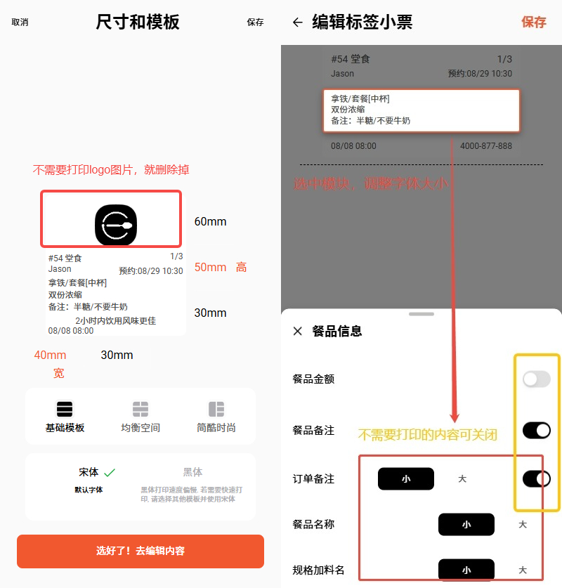 修改内容:左右滑动选择需要修改的小票,点击进入编辑页面,从底部向上滑动,即可修改具体设置,如某部分是否展示,字体大小、行间距;