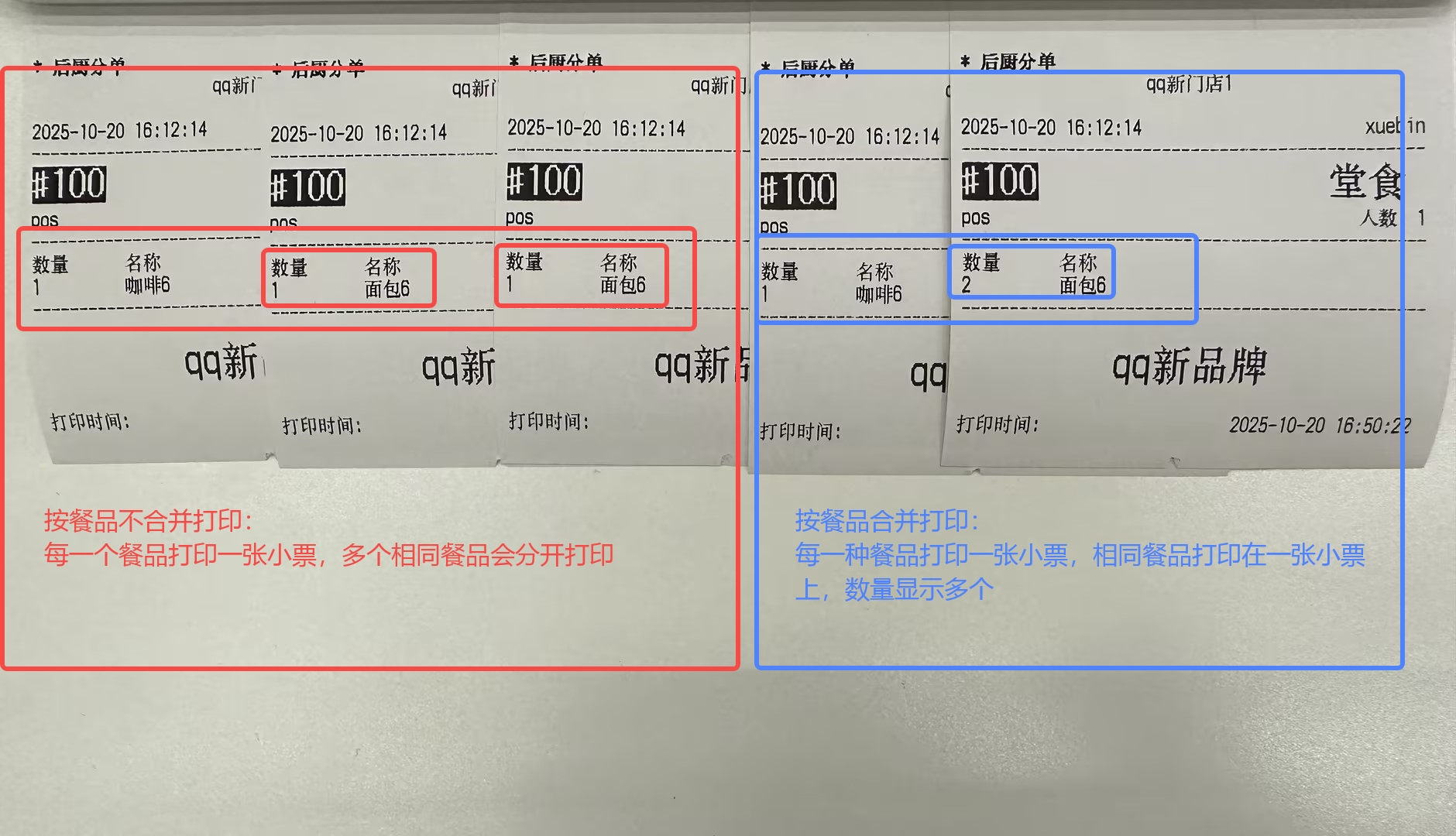 不合并打印:同一个餐品购买两份时,打印两张后厨小票,各显示面包*1,面包*1