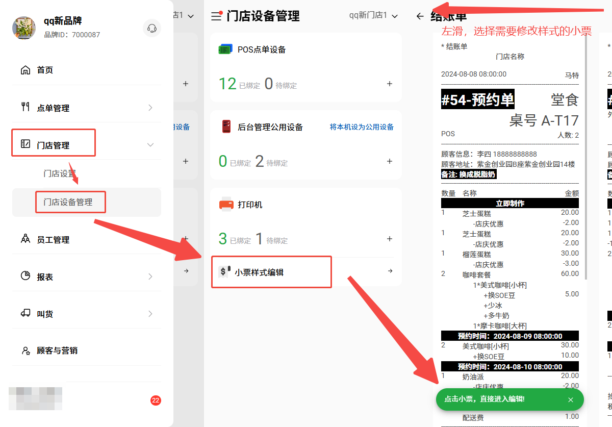 壹向RMS左上角功能中心--门店管理--门店设备管理--小票样式编辑,左右滑动选择需要修改的小票,点击进入编辑页面