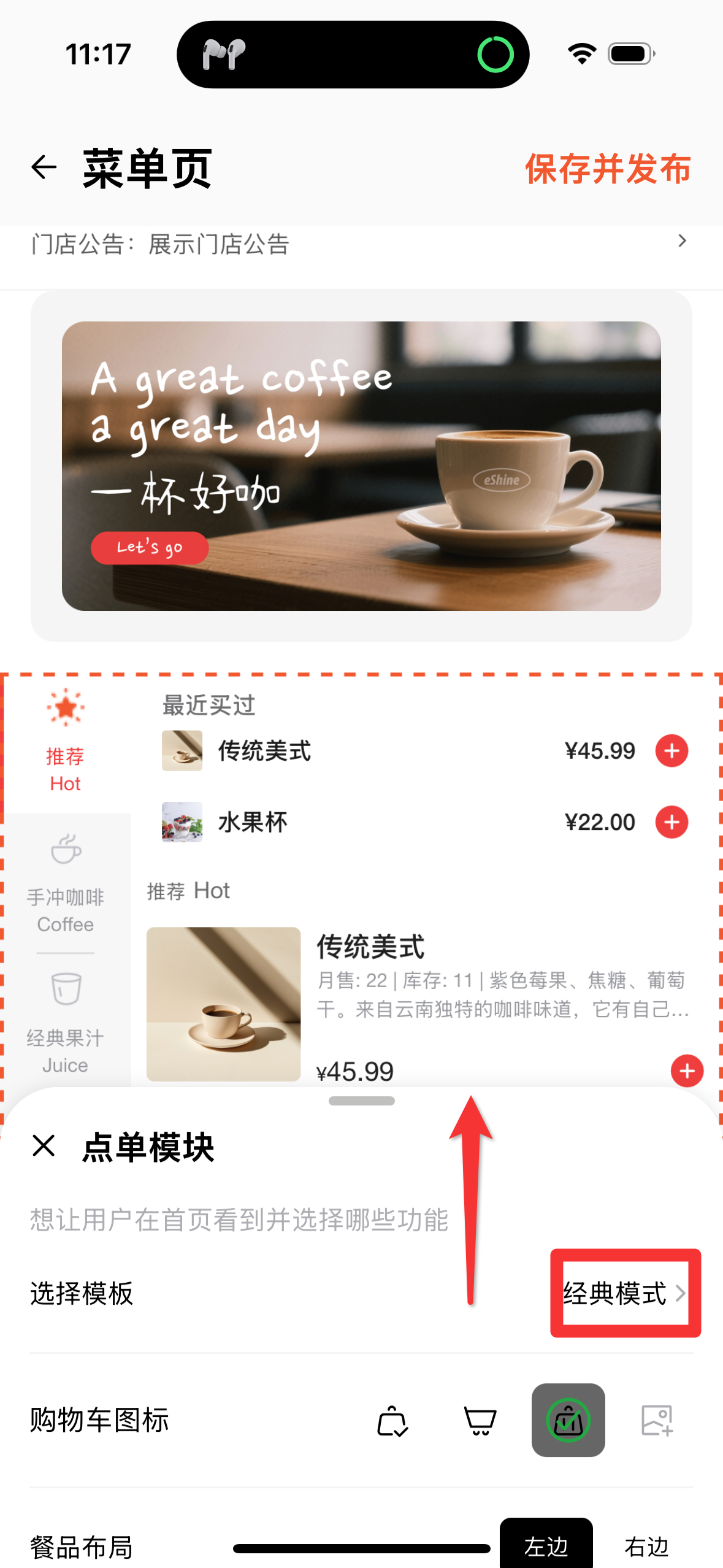 模版查看我们提供5个点餐模版,商家可根据门店情况及喜好选择使用。经典模版适用于大多数商家经典瀑布流适用于餐品数量在12-20个的商家瀑布流适用于餐品数量在12-20且分类较少的商家超级大图适用于餐品数量<9个,且分类较少的商家图片模式分类在顶部,适用于图片优质,餐品数量<20个的商家设置路径RMS➡️ 点单管理➡️ 小程序装修➡️ 模版➡️ 左滑至菜单页➡️ 触碰分类 出现点单模块后上滑,即可选择菜单模版,【确定】后【保存并发布】。