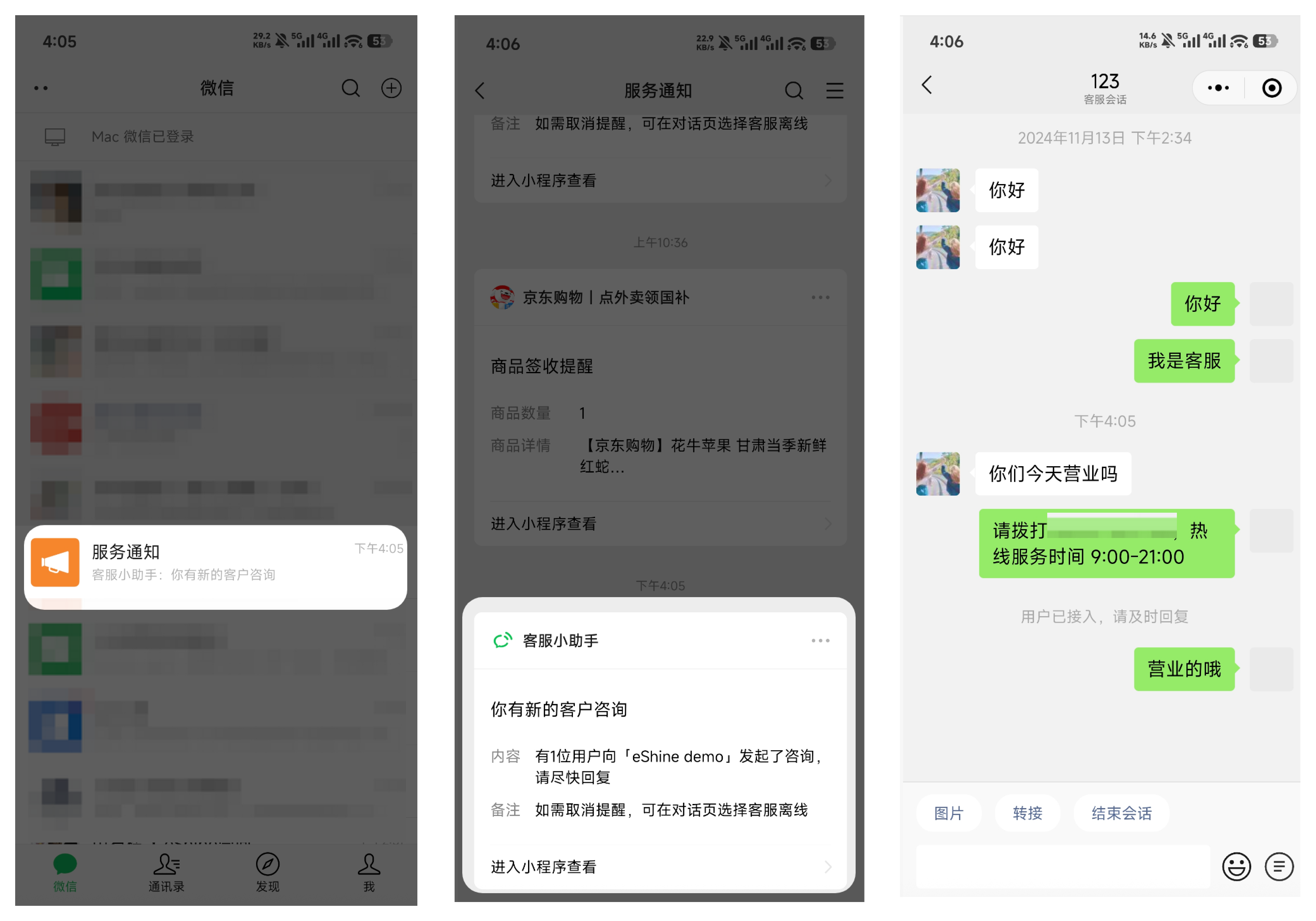功能介绍:顾客在小程序里咨询客服,商家在微信上回复