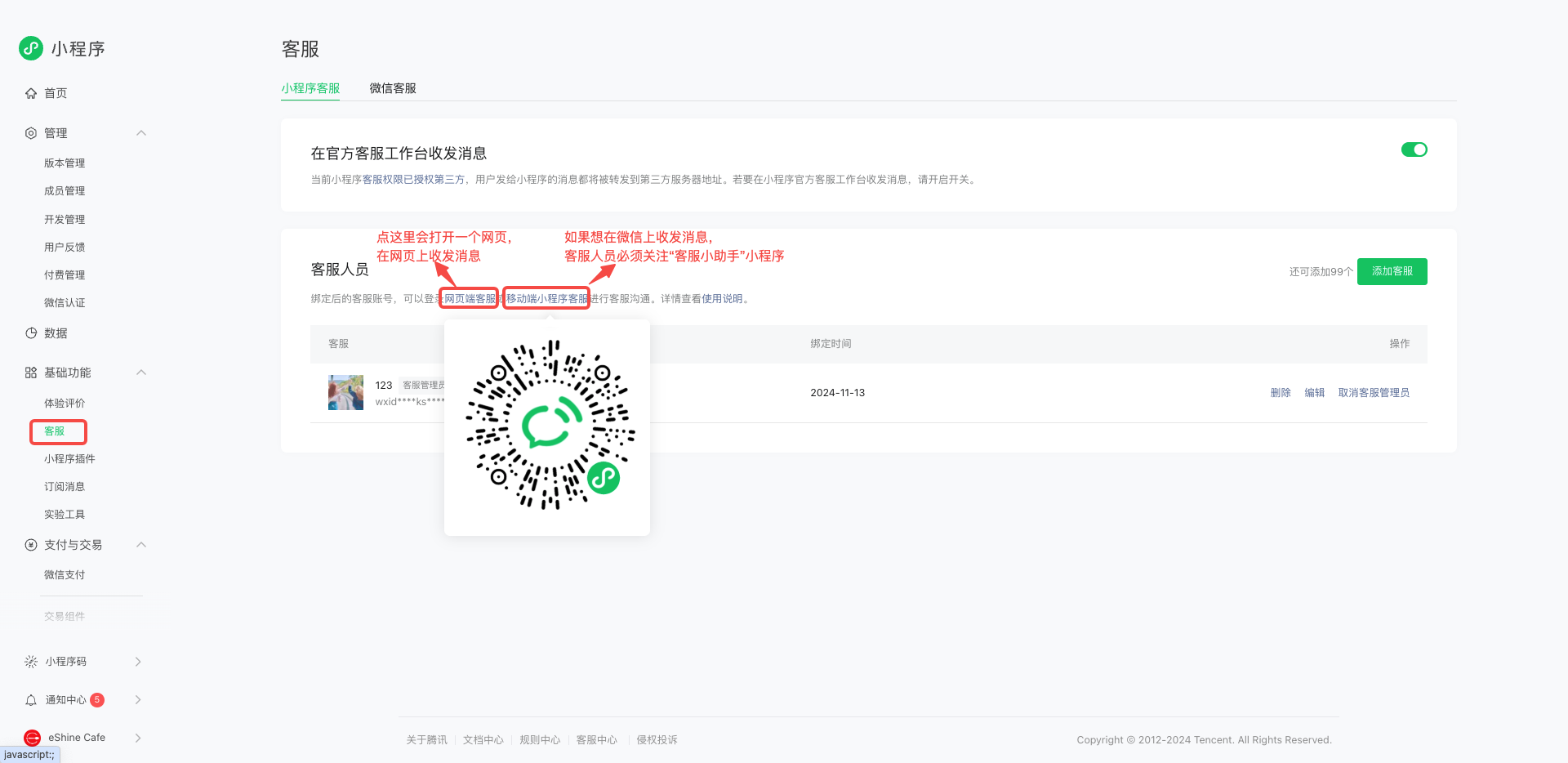 登录 https://mp.weixin.qq.com (用小程序的超级管理员的微信扫码登录),在左侧【基础功能】-【客服】,下方添加客服人员,绑定客服微信,最多可绑定100个客服人员微信