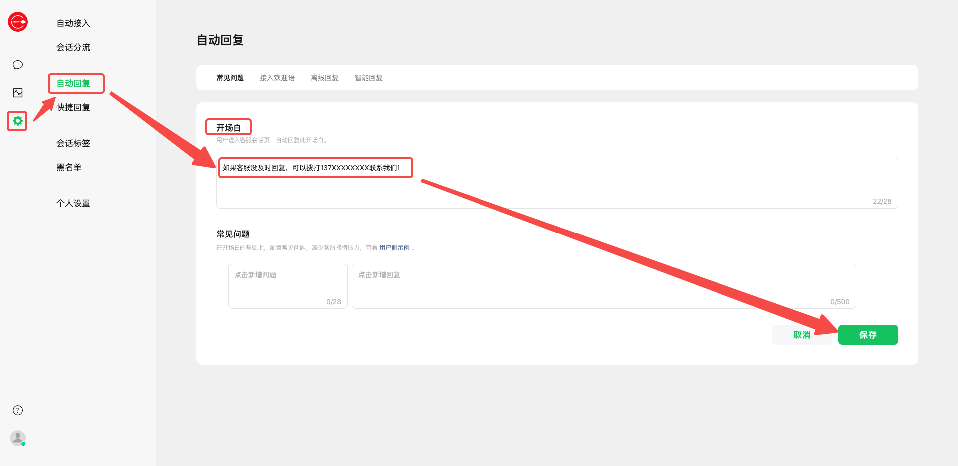 若您担心微信上未及时看到消息,点击上图中的【网页端客服】,进入到网页端客服界面之后,在 【设置】-【自动回复】可设置开场白,引导拨打商家电话,如图: