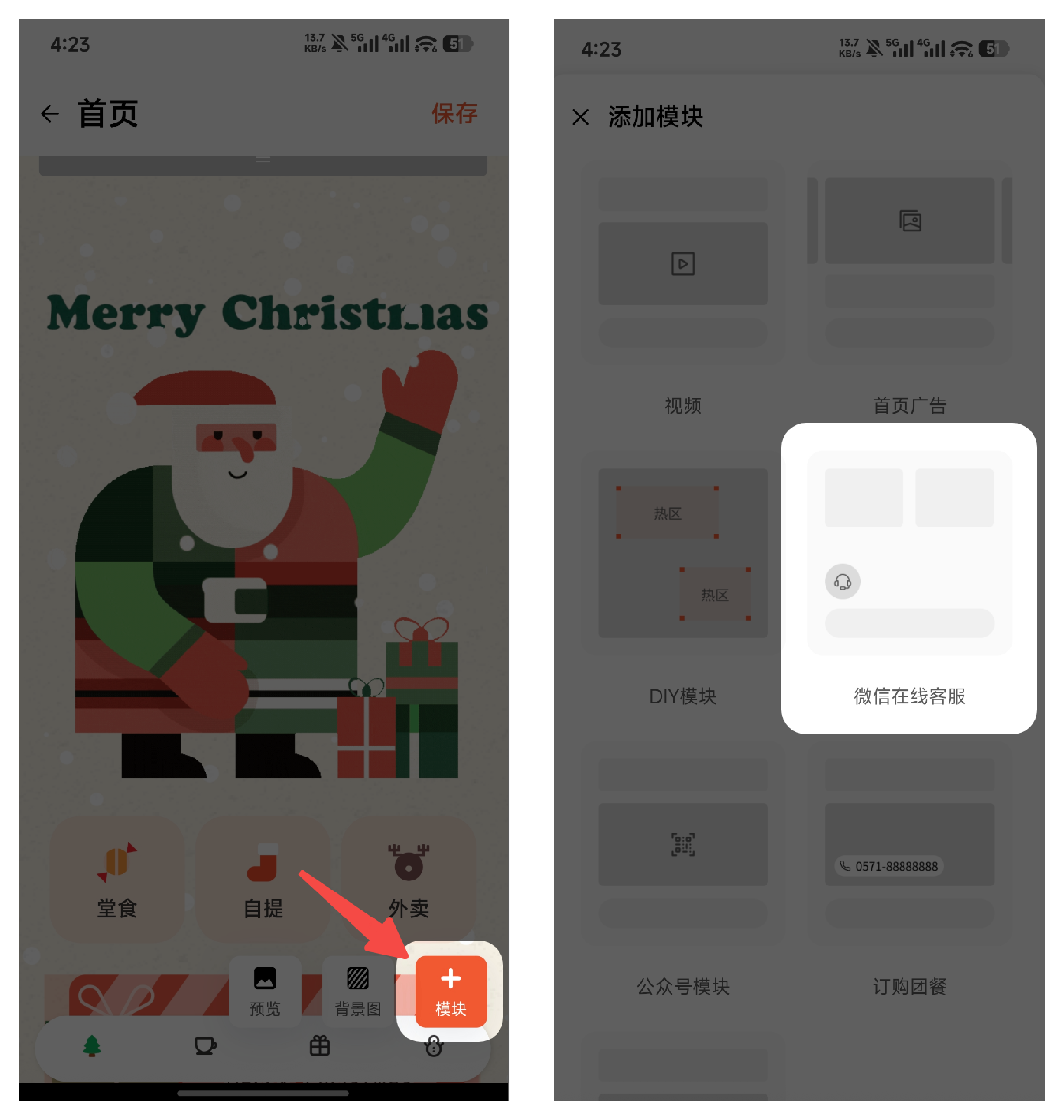 功能入口:壹向RMS app - 左上角三条横线 - 点单管理 - 小程序装修 - 点击在用模版 - 向左滑动找到首页 - 点击进入编辑 - 右下角“+模块” - 微信在线客服